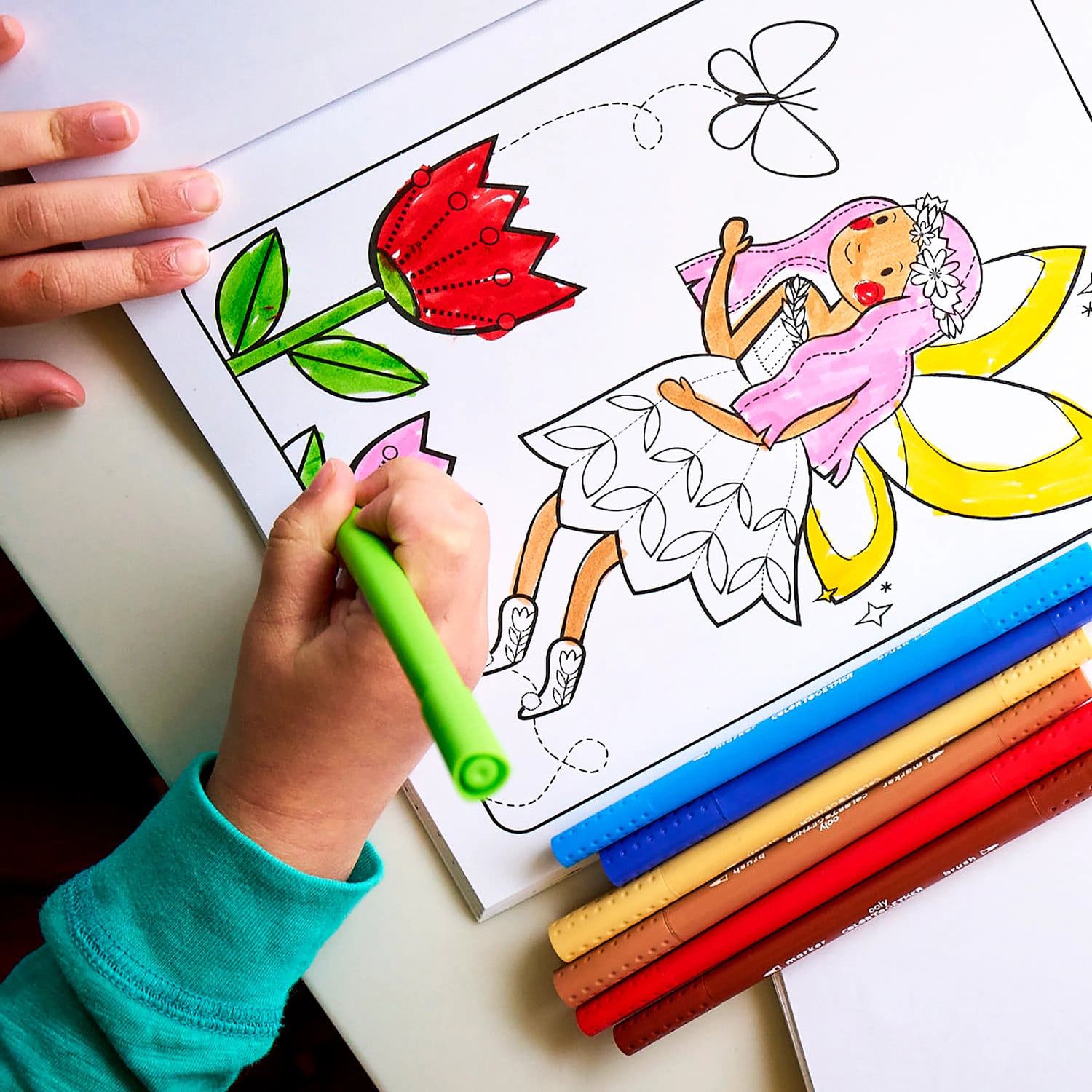 Ett set tuschpennor som bjuder in till färg och kreativitet, med både klassiska färger och hudtoner. Färgpennorna har en penselspets i ena änden för mjuka drag och större färgytor, och en smalare spets i den andra för linjer och detaljer.
