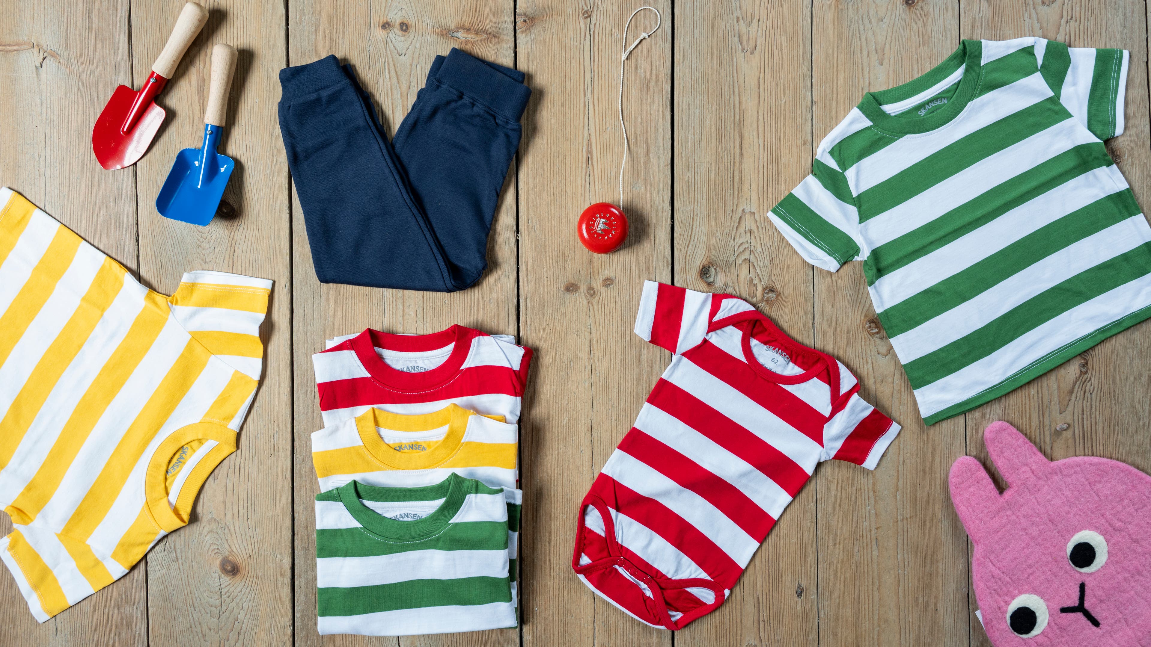 I sortimentet finns randiga bodys i färger som rött, grönt och gult, tillsammans med matchande t-shirts och mjuka marinblå byxor. De passar lika bra för vardagsäventyret som för lugna stunder hemma. För de allra minsta finns också babyplagg i samma mjuka material.