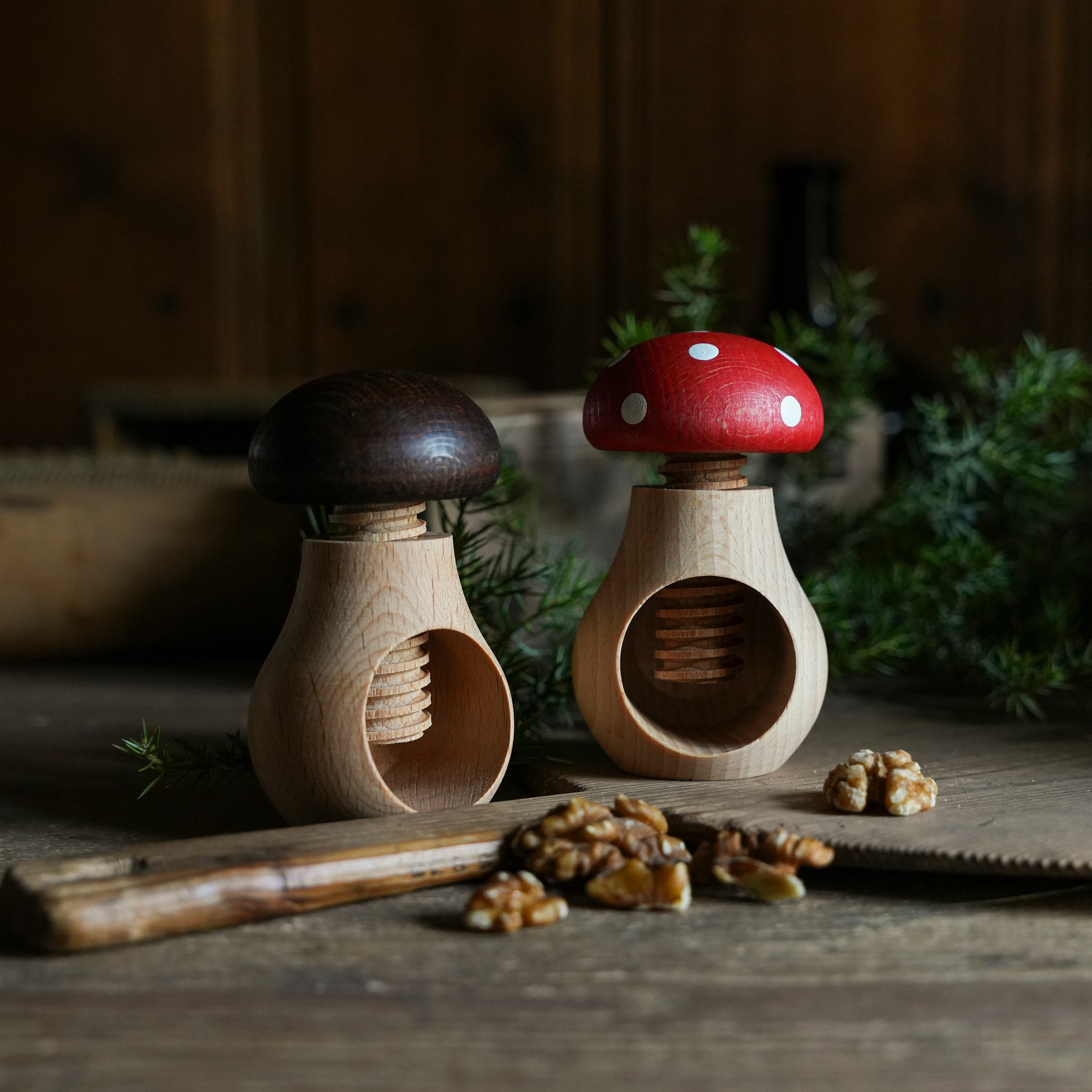 Cute Nutcracker in the Shape of a Toadstool, Made of Oiled Beech Wood. Twist open the mushroom cap, place the nut inside, and twist it back down to crack the shell. A fun and practical gift for someone who has everything.