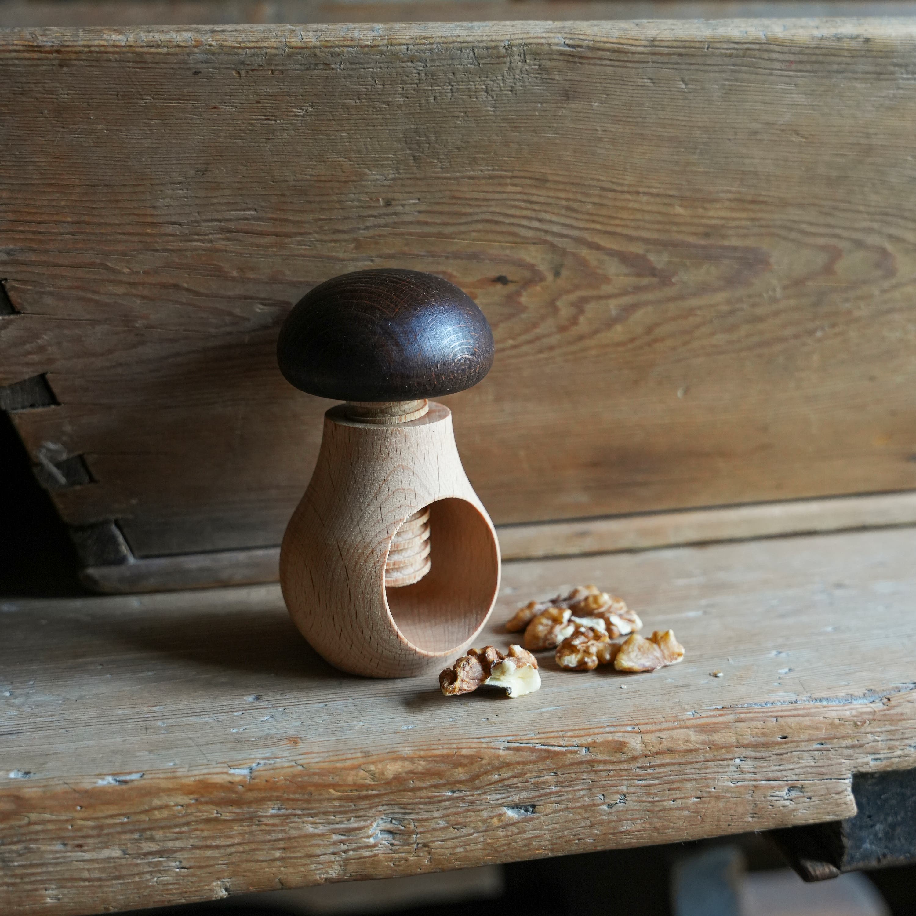 Cute Nutcracker in the Shape of a Toadstool, Made of Oiled Beech Wood. Twist open the mushroom cap, place the nut inside, and twist it back down to crack the shell. A fun and practical gift for someone who has everything.