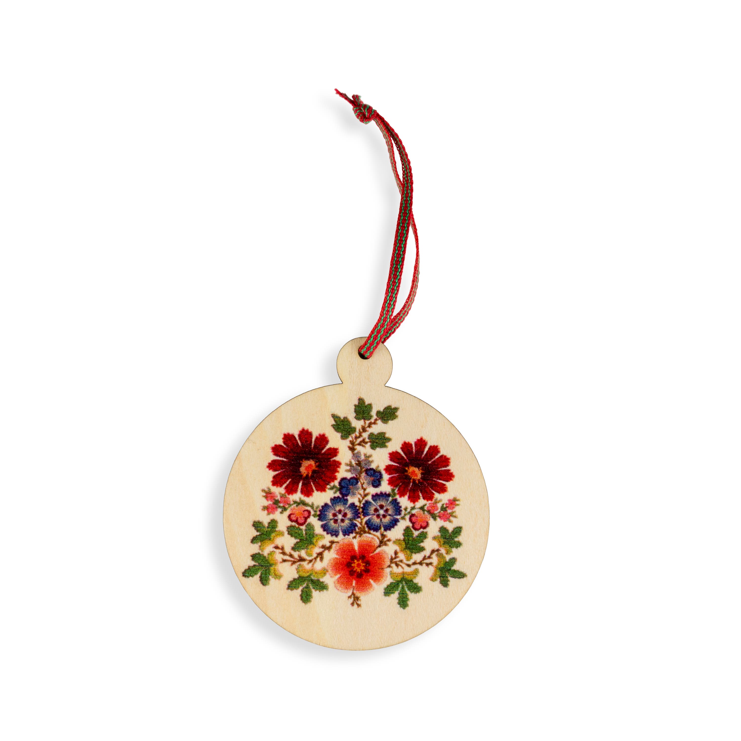 Decorative wooden ornament featuring a floral pattern taken from the jacket of the traditional Dalafloda folk costume. Looks just as lovely in the Christmas tree, in a window – or as a charming detail on a gift.