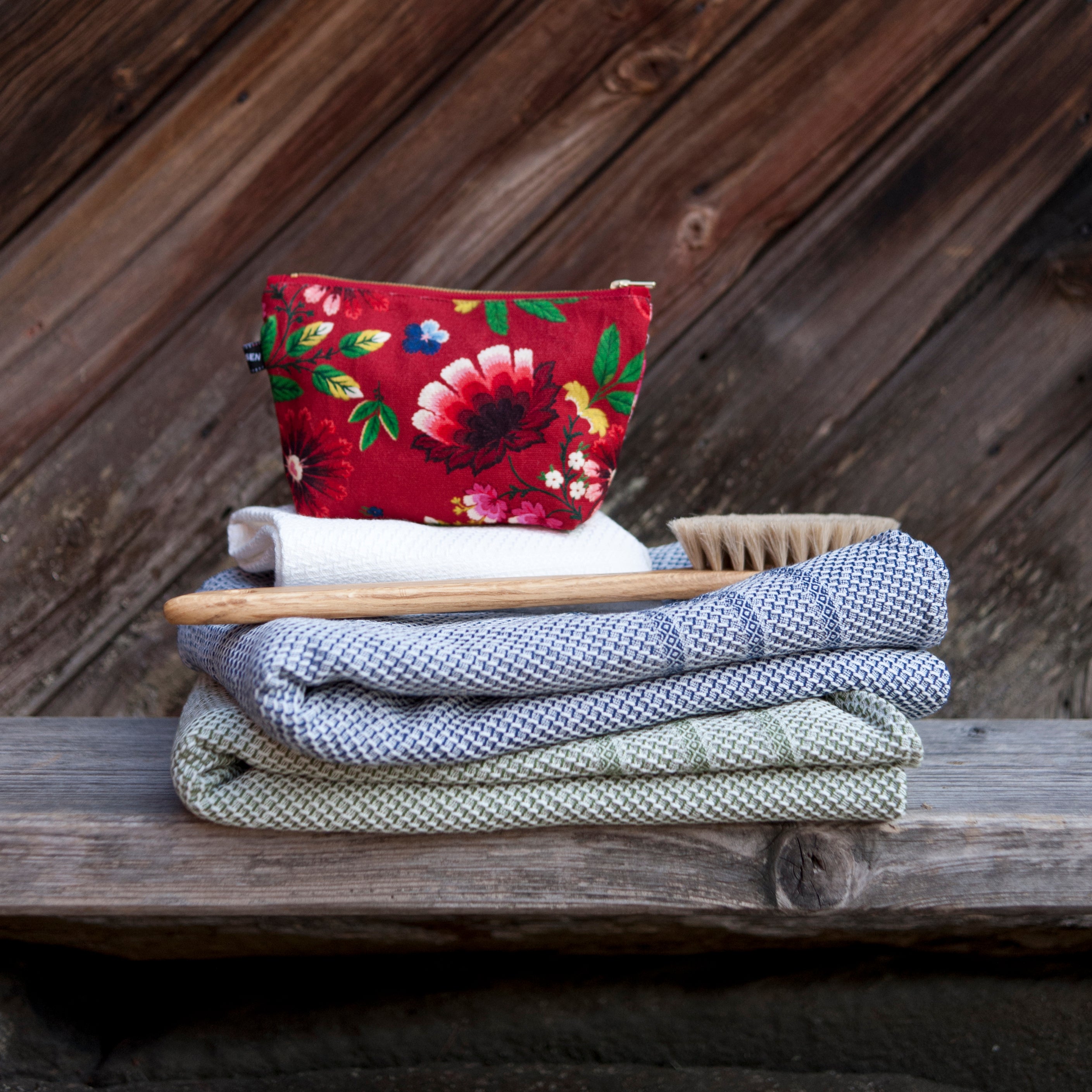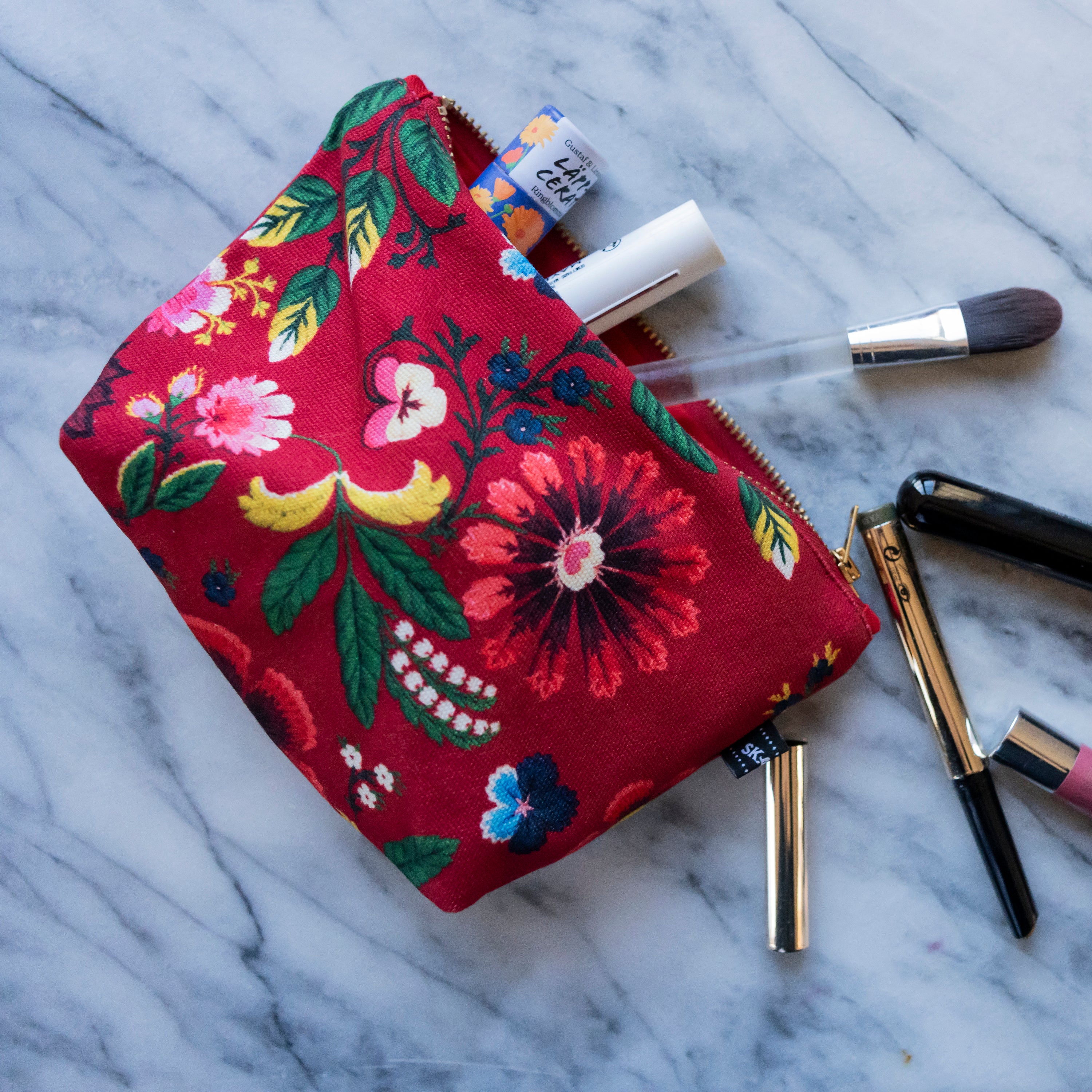 Store your makeup and beauty essentials in this stylish cosmetic bag featuring a beautiful floral pattern inspired by the jacket of the Dalafloda folk costume. Made from 100% organic, GOTS-certified cotton and lined with solid red fabric.