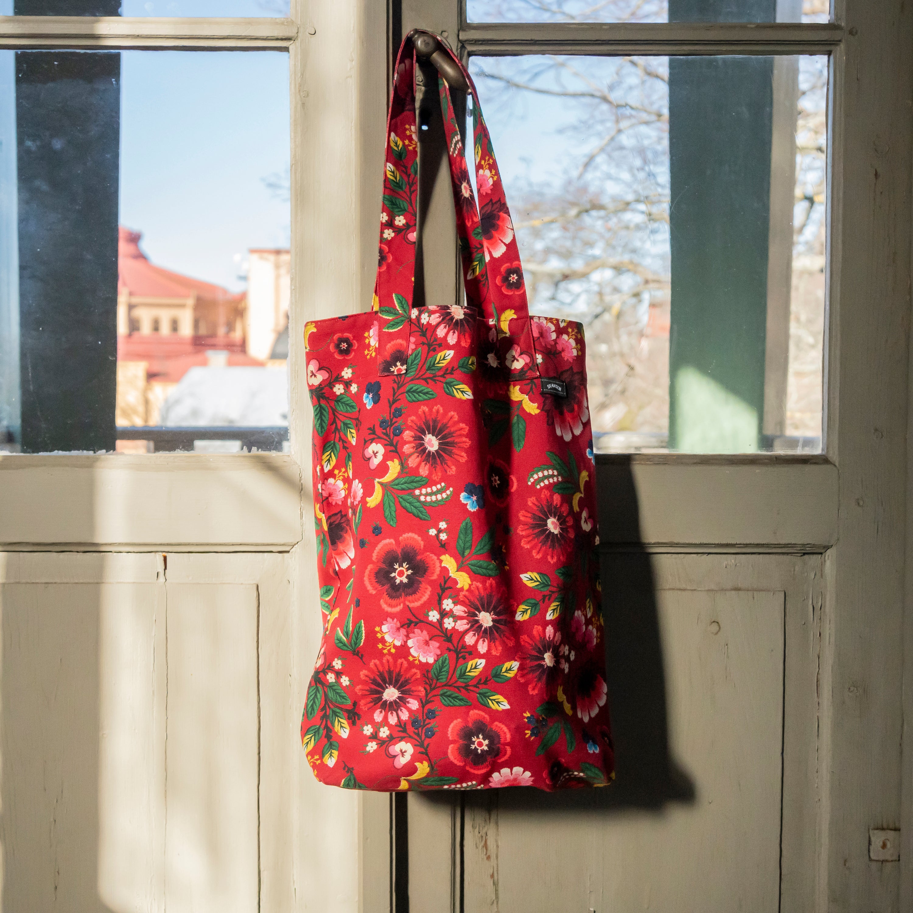 Beautiful fabric bag with a floral pattern inspired by the jacket of the Dalafloda folk costume. Made from 100% organic, GOTS-certified cotton. Perfect for carrying your belongings or taking with you when shopping to help reduce the use of plastic bags.