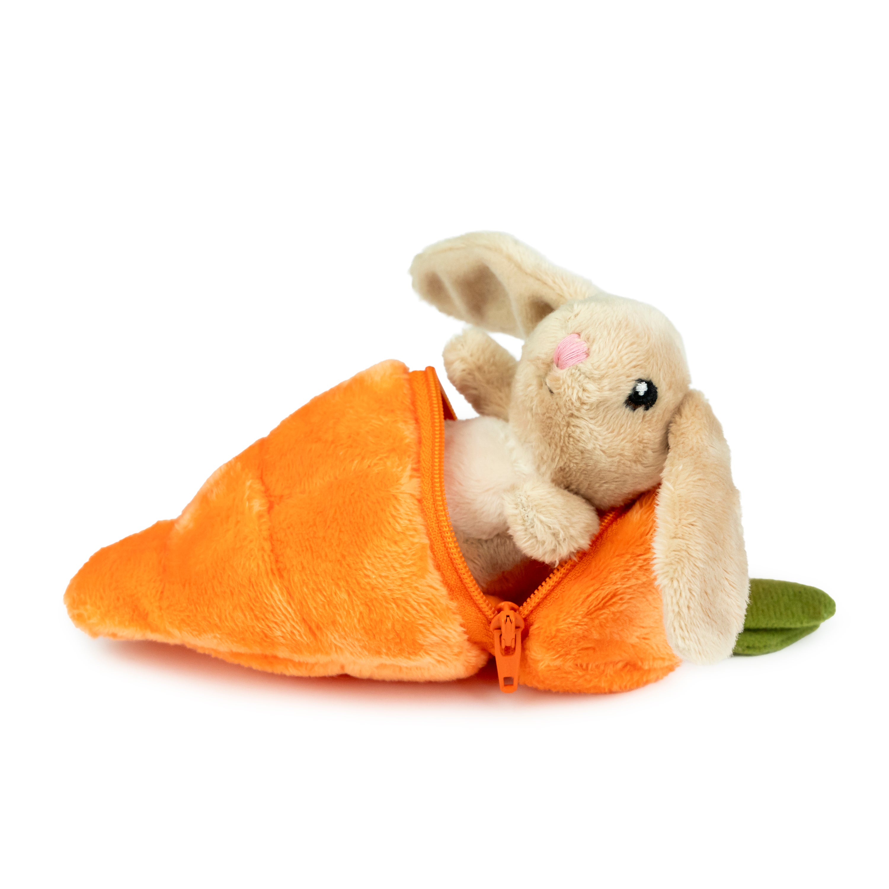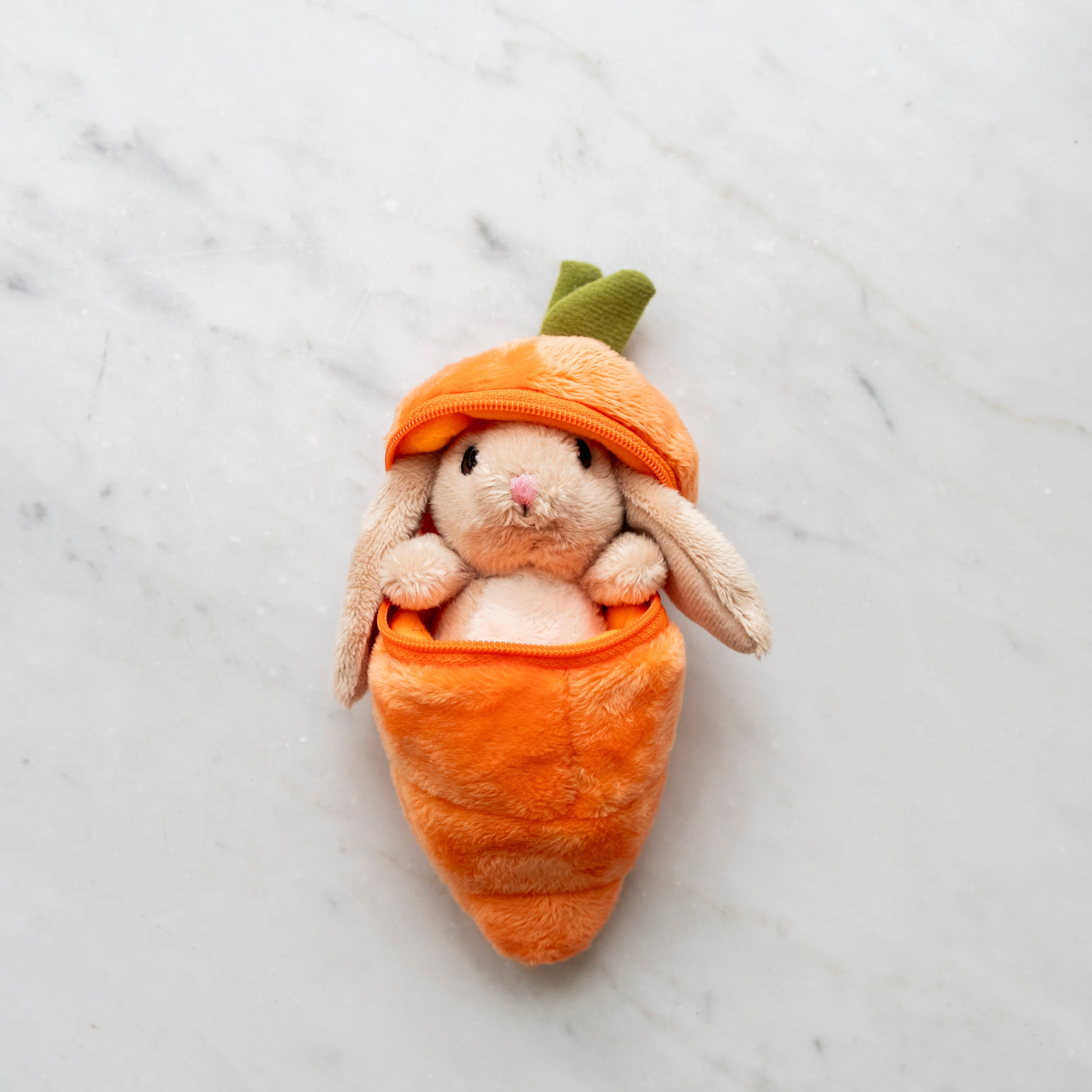 A soft carrot with a zipper that hides a cuddly bunny inside. When the carrot is opened, the little bunny peeks out, ready to join in on playtime, rest and small adventures. The soft toy is made from 100% recycled PET bottles and features embroidered eyes and nose. The bunny can easily be tucked back into the carrot, making the set easy to bring along and fun to take out again and again. Suitable for children from 0 years and up.