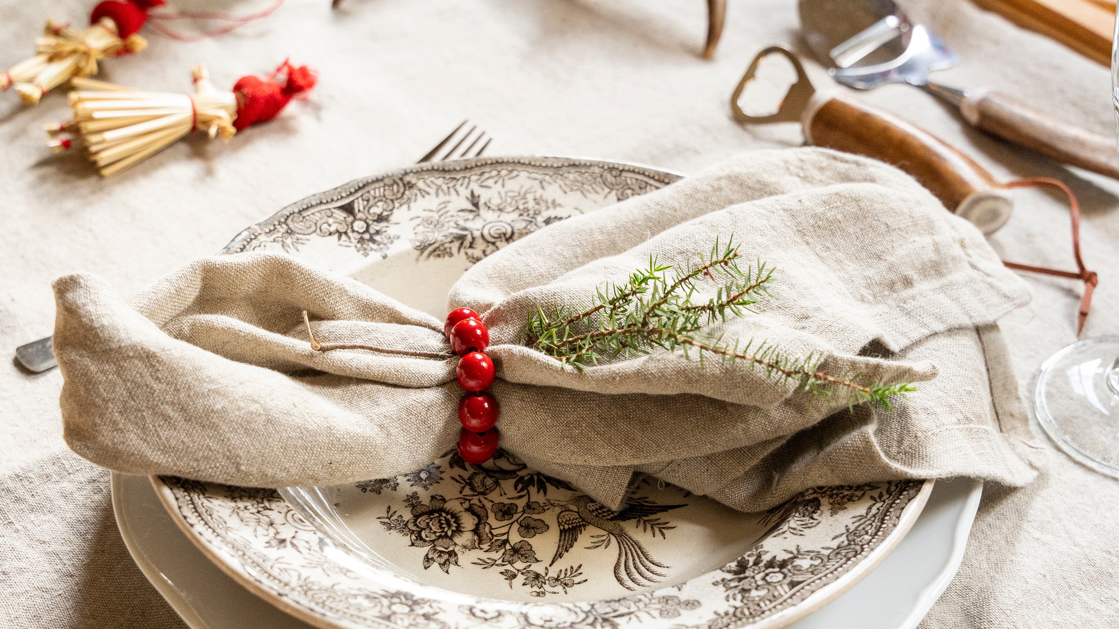 A linen tablecloth in muted shades like beige or grey forms the foundation of a nature-inspired Christmas table setting. The neutral base highlights natural elements such as green sprigs and wooden details, while creating a harmonious and timeless look.