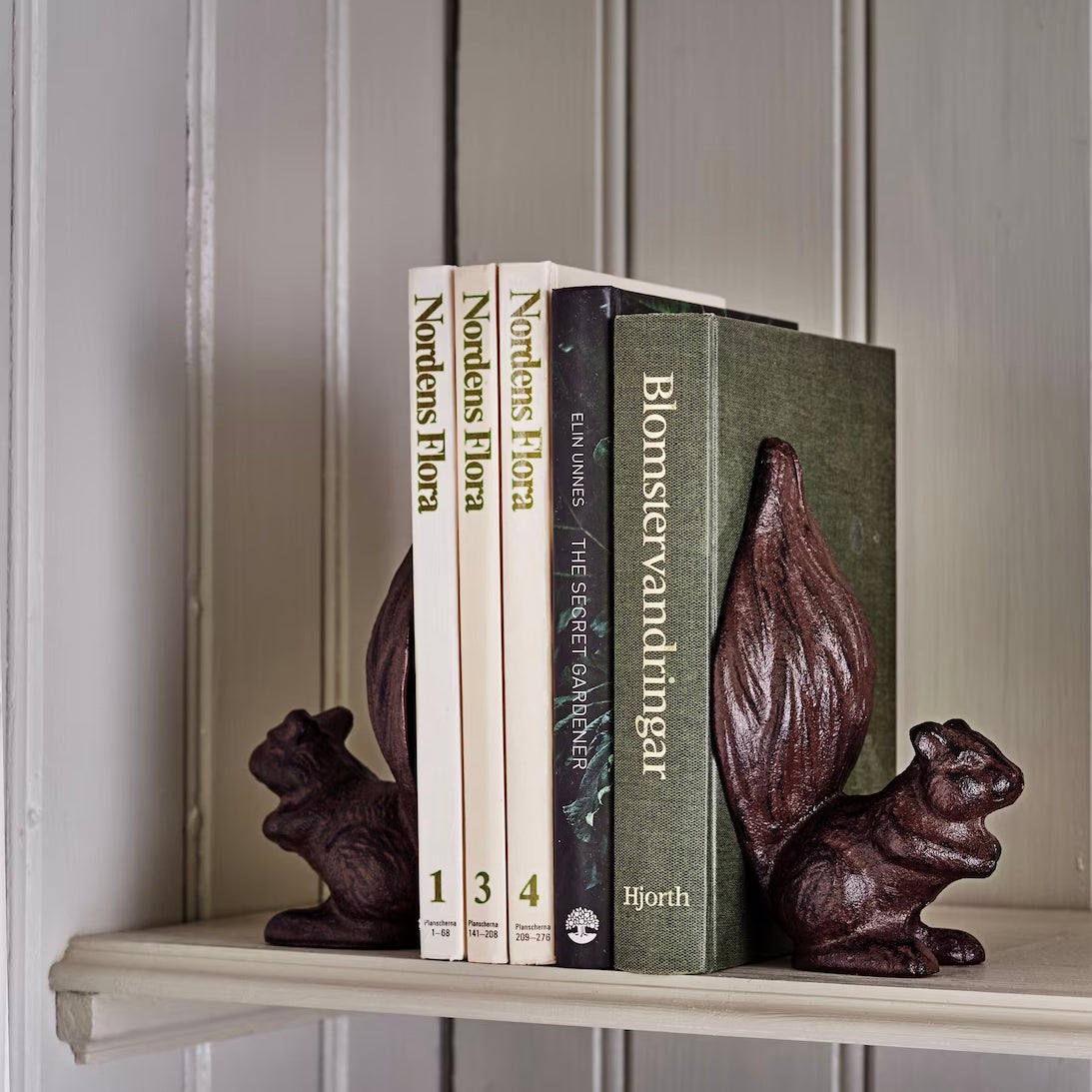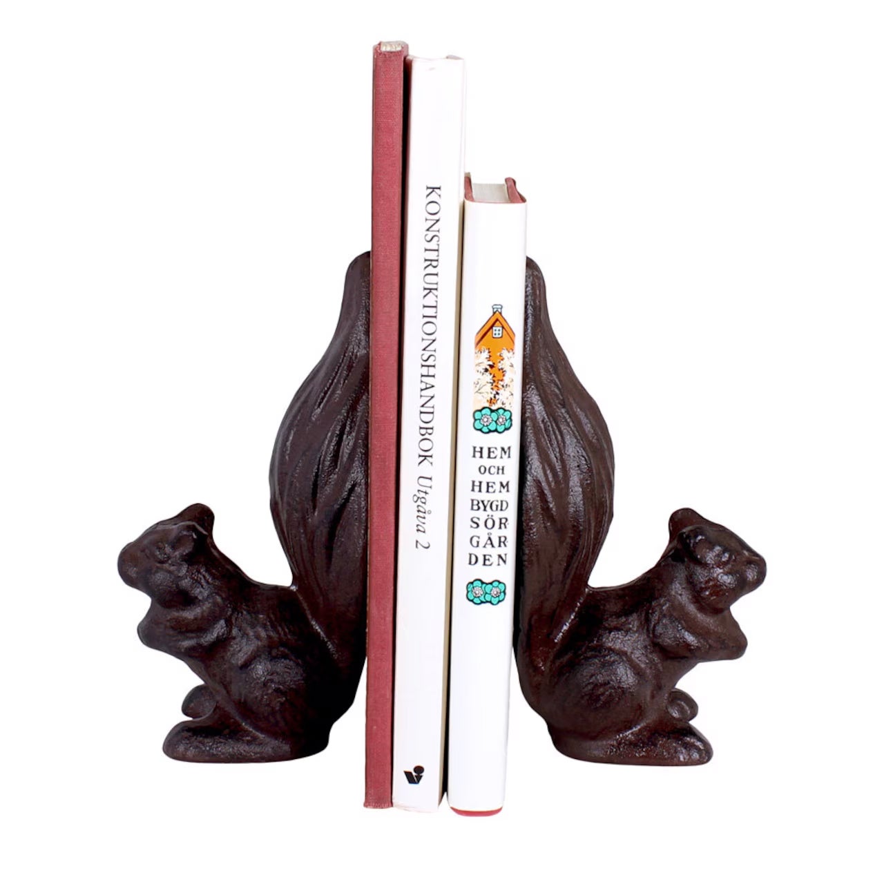 Cute and sturdy bookend in the shape of a squirrel, made of dark brown cast iron. A lovely decorative piece that keeps your books in place and fits just as well on a bookshelf as on a desk. Sold individually.