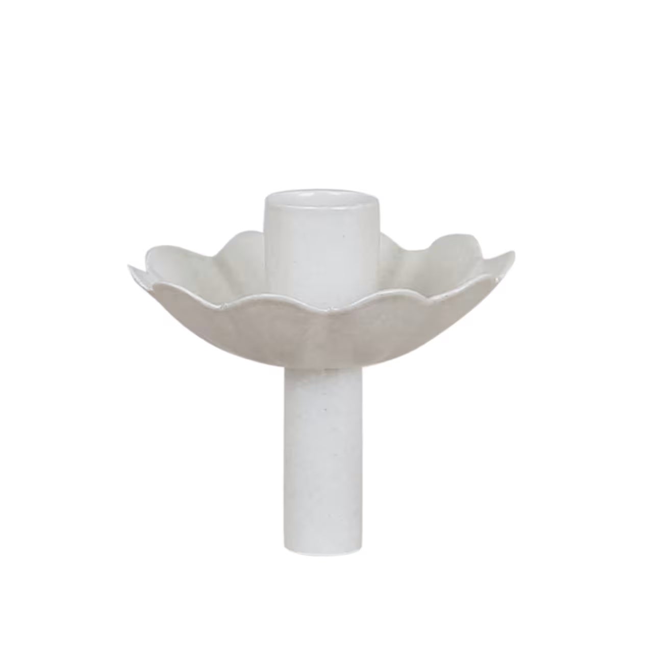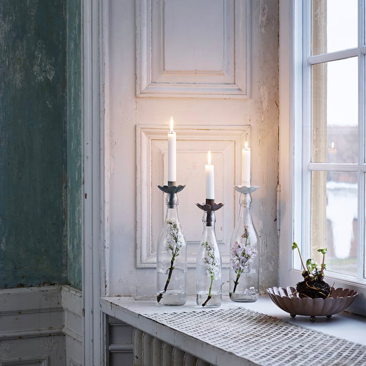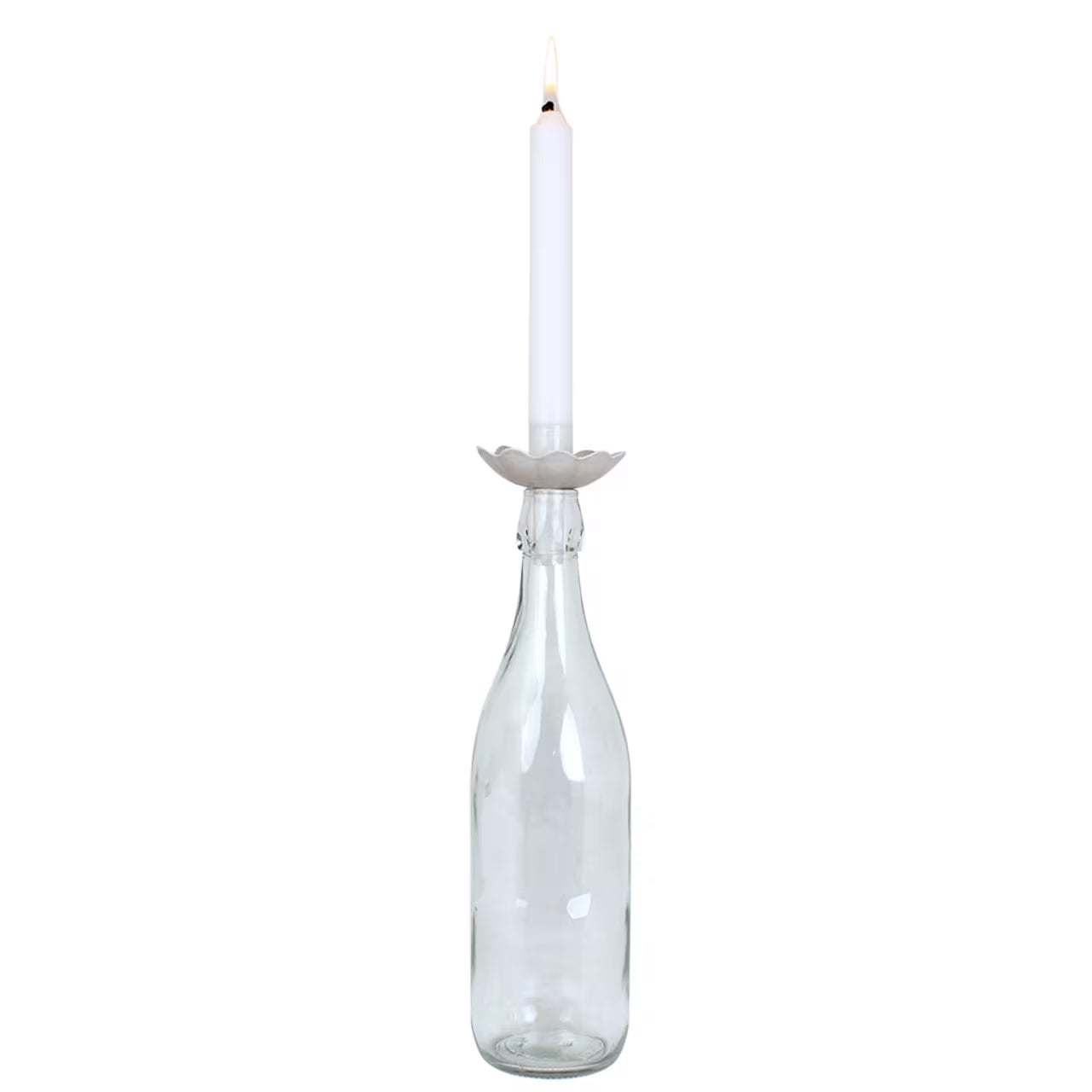 White candle holder for taper candles with a decorative edge that transforms an empty bottle into a stylish candlestick. Handmade with wavy, hand-cut edges, so slight variations in color and shape may occur.