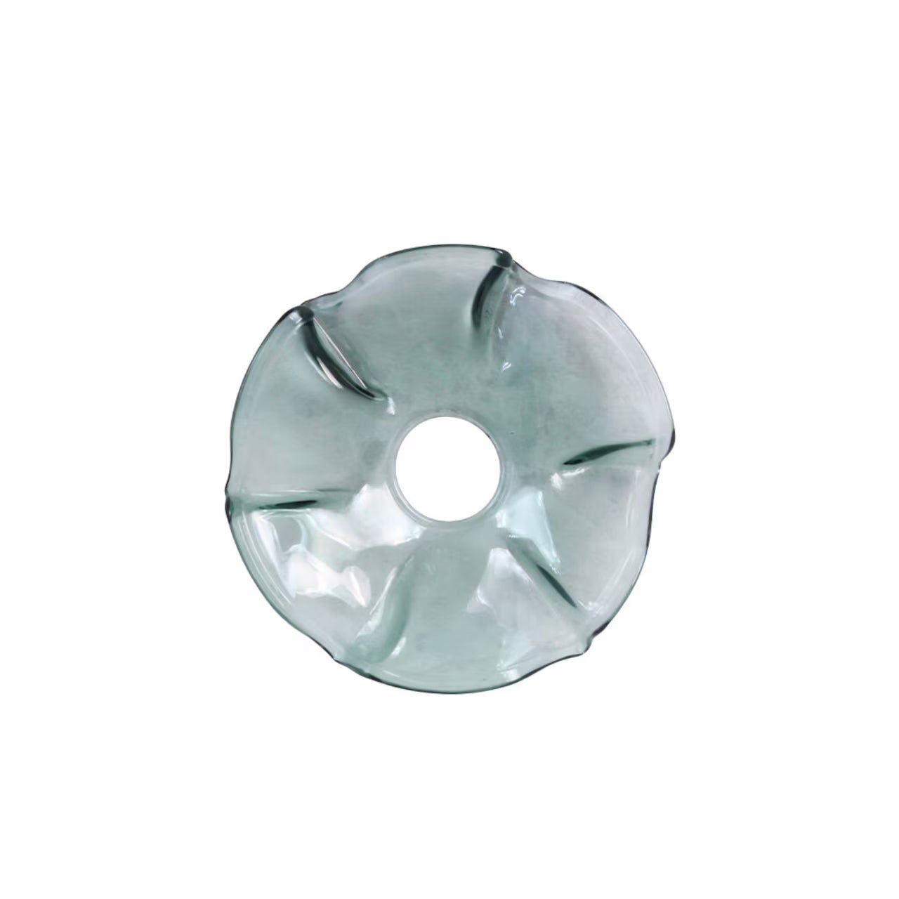 A candle ring in green glass with an irregular texture and scalloped edges. In addition to being a stylish decoration around the taper candle, it also protects both the candle holder and the surface from dripping wax. A candle ring elevates even the simplest candle holder and adds a personal touch to your home.