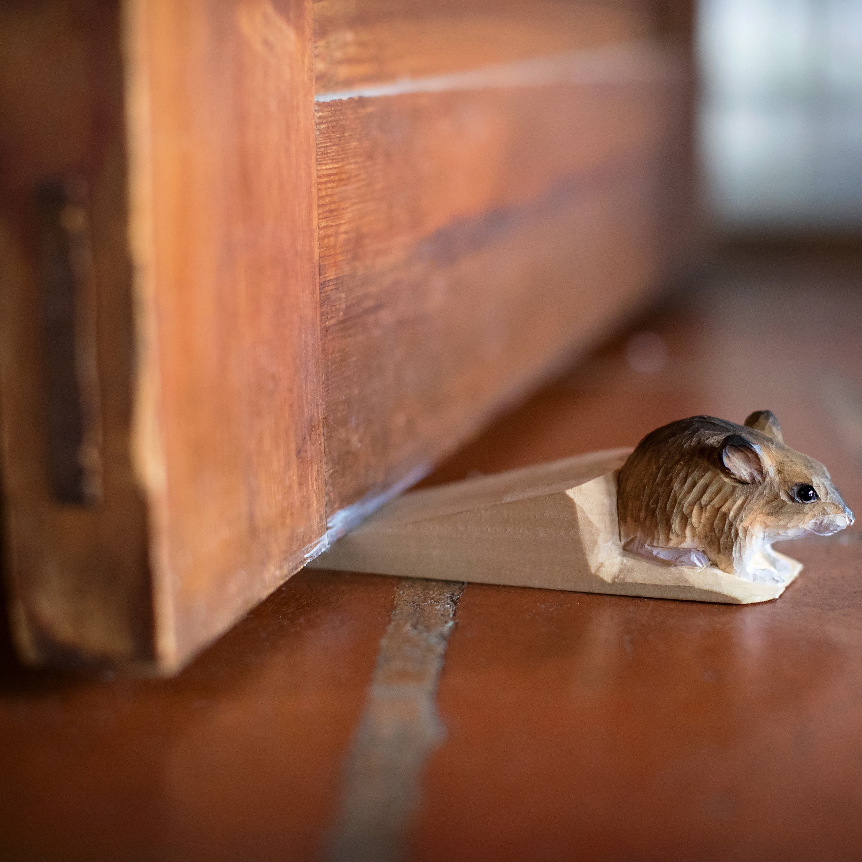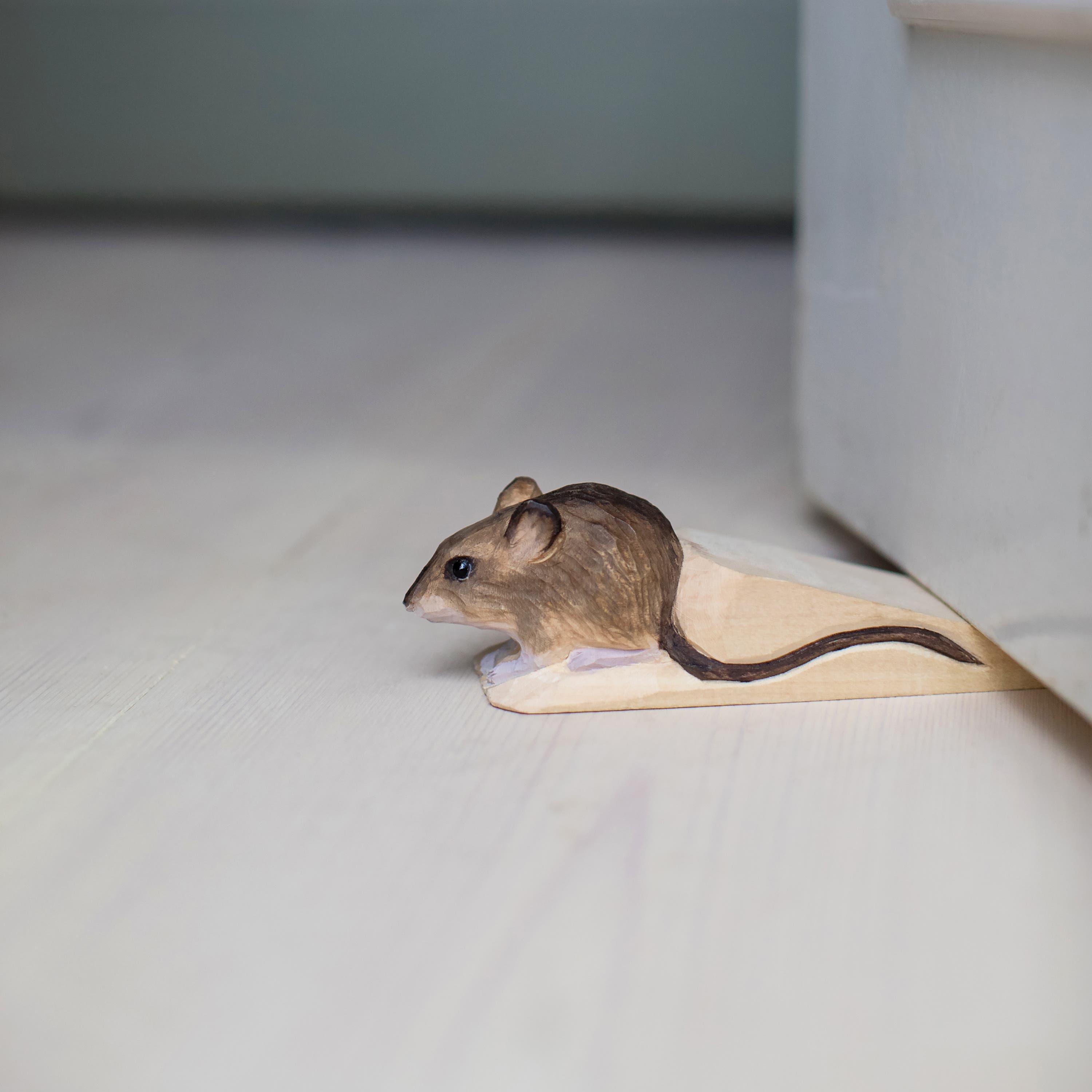 Smart doorstop made of wood. Hand-carved wood mouse with a silicone-coated underside that ensures stability and keeps the door in place.