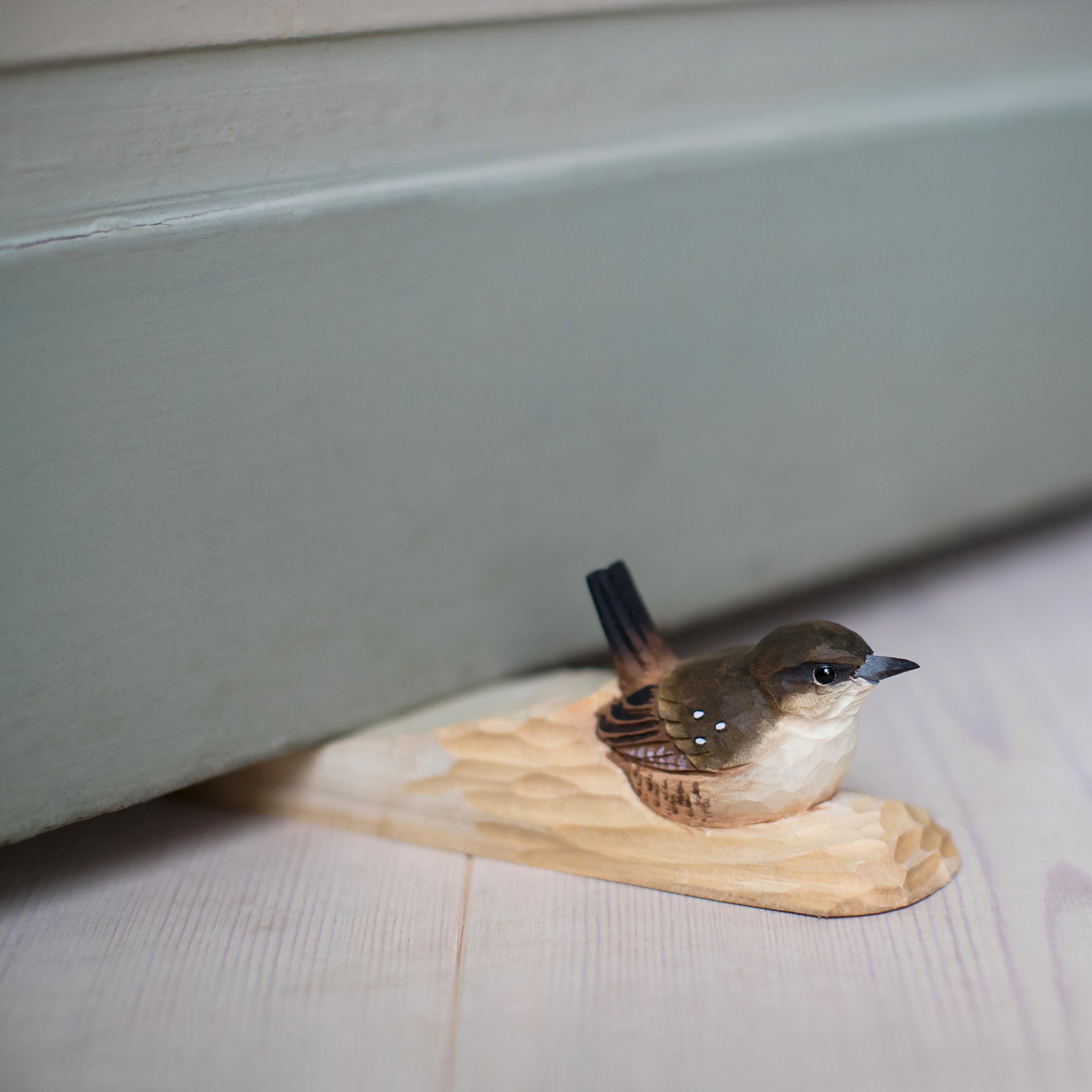 Smart doorstop made of wood. Hand-carved wren with a silicone-coated underside that ensures stability and keeps the door in place.