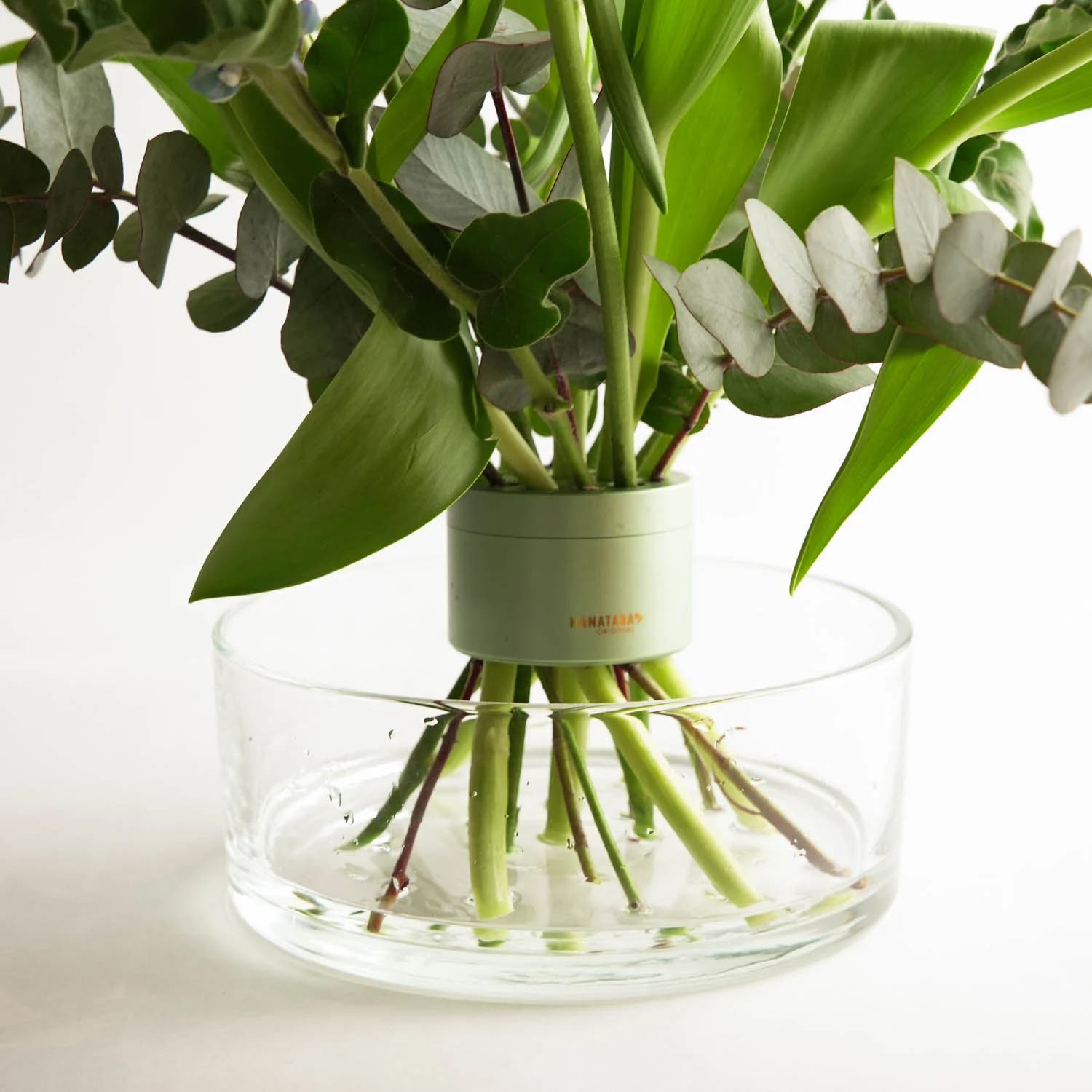 A low glass vase with a heavy base pairs especially well with the Kenzan Ring. Made of sturdy clear glass, it gives each flower room to shine – from serene ikebana arrangements to wild garden bouquets.