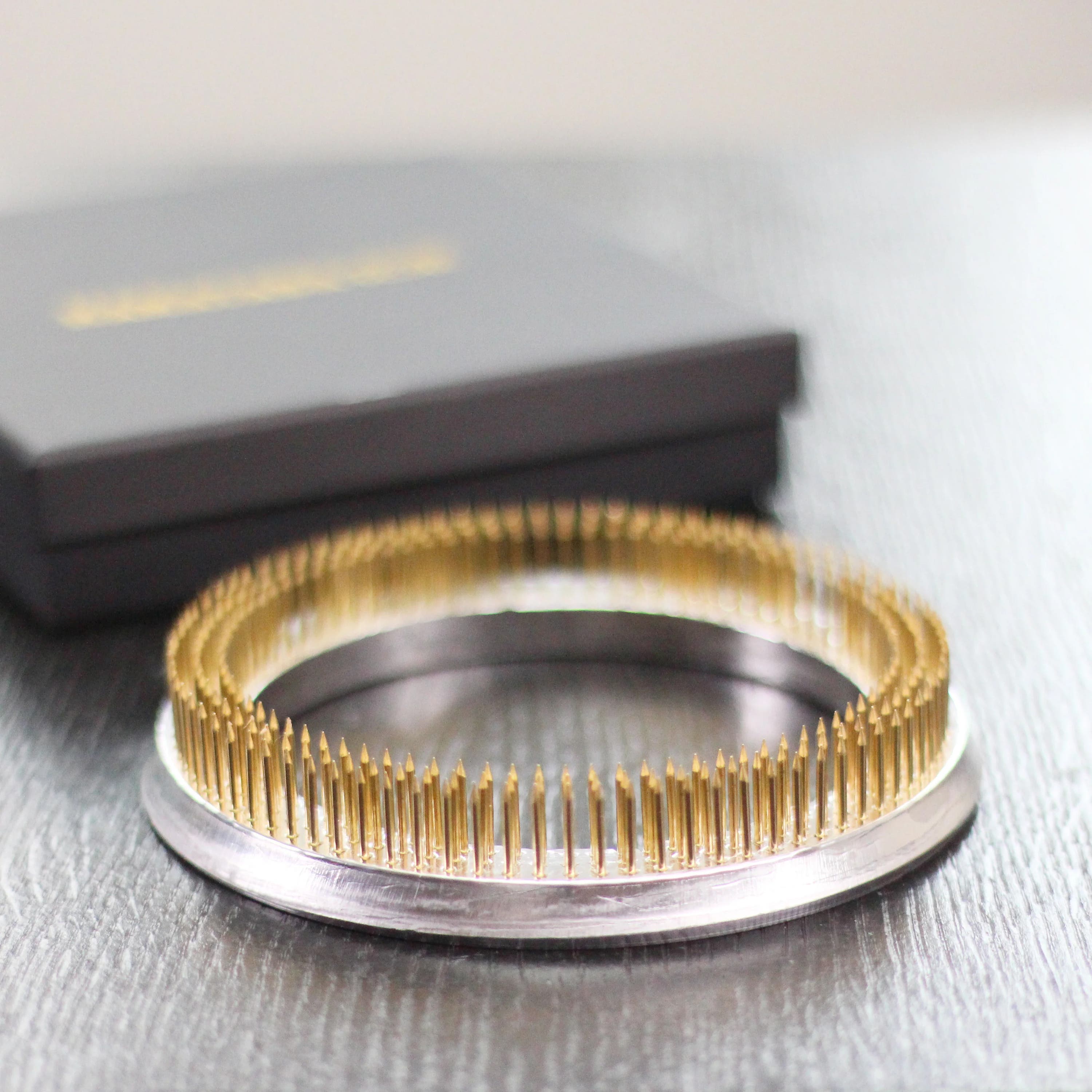 Made of heavy pewter alloy with sharp copper pins that hold even thicker stems firmly in place. Place the ring at the bottom of a vessel, insert your plant materials, and add water until the cut surfaces are fully covered.
