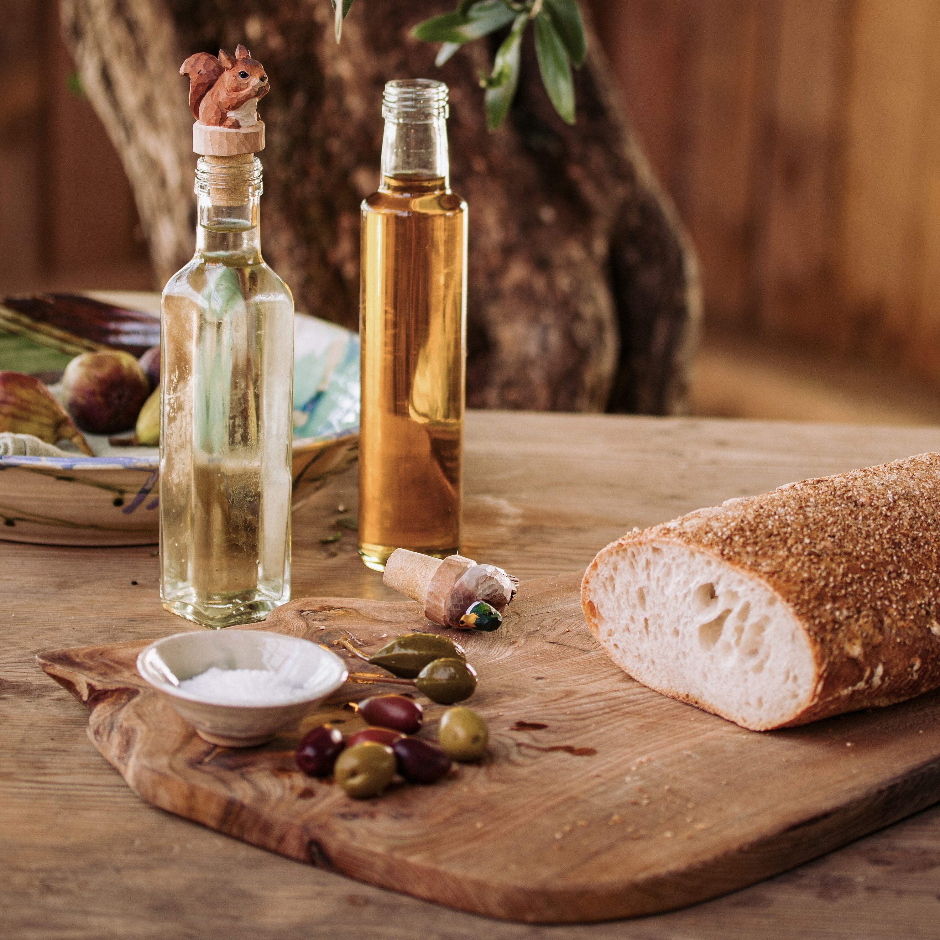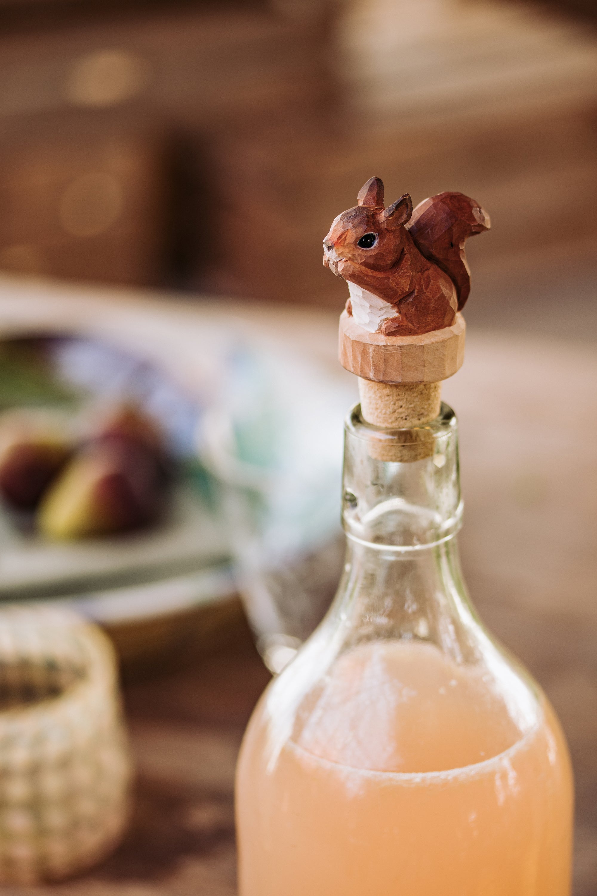 Hand-carved bottle stopper in the shape of a squirrel. Fits most bottles and keeps beverages, dressings, oil, or vinegar fresh. The squirrel is carved from wood and painted with eco-friendly colors. Perfect as a gift and comes in packaging that can be hung on the bottle neck. Clean with a damp cloth if needed and do not wash in the dishwasher.