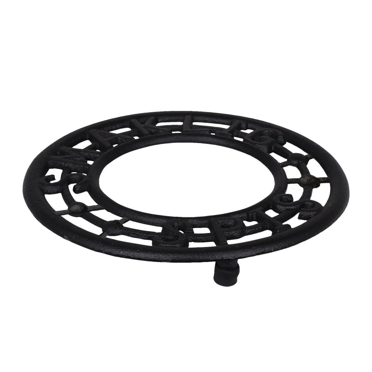 A round cast iron trivet in black, suitable for both pots and pans. The pattern with the text “Smaklig spis” (roughly “enjoy your meal”) makes it a detail you’ll want to keep on the table, ready for the next meal.