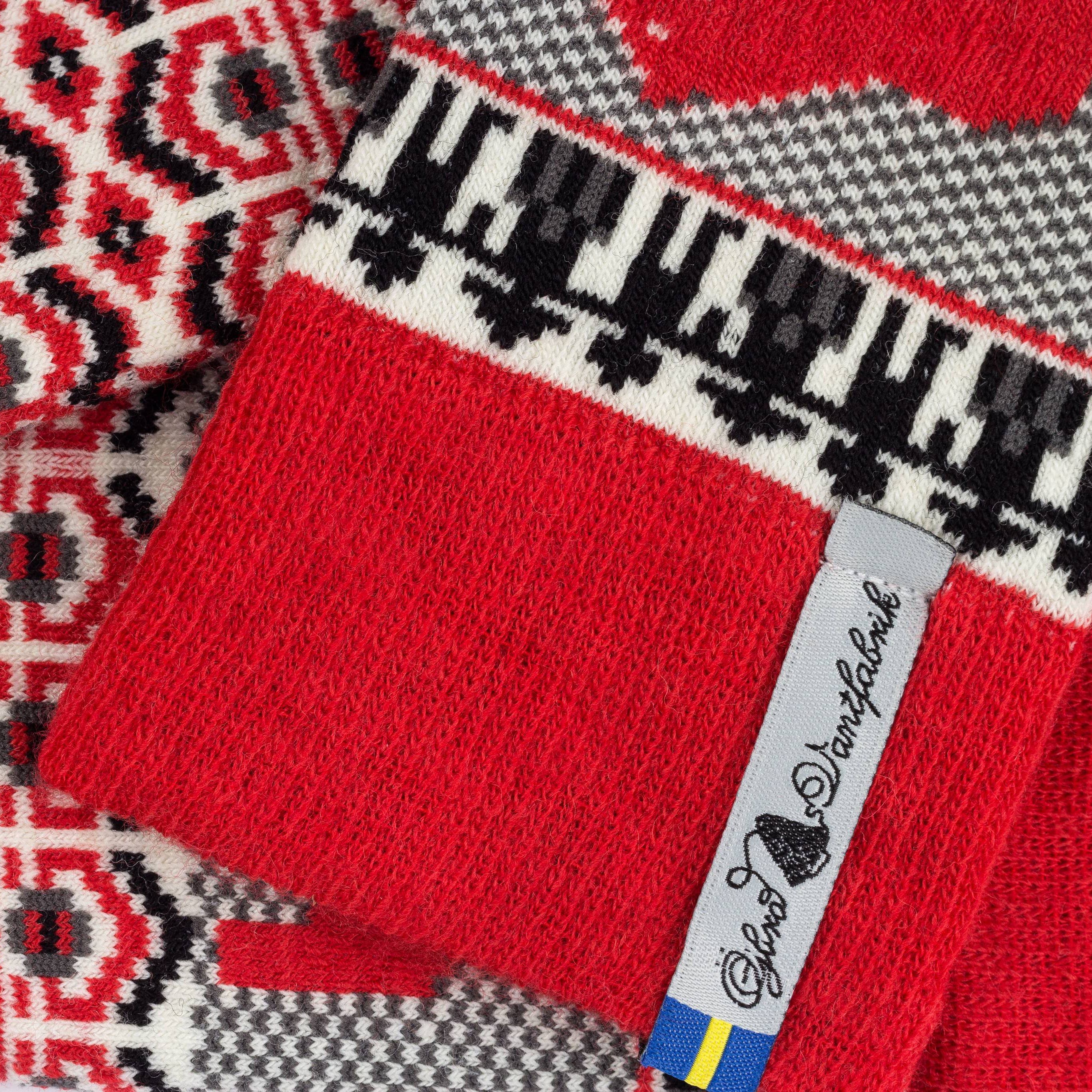 Knitted socks made of 80% merino wool. Pattern inspired by the swedish region Dalarna. Knitted in Grönahög in the southern part of Sweden. Made of: 80% Merino wool, 15% Polyamid and 5% Lycra.