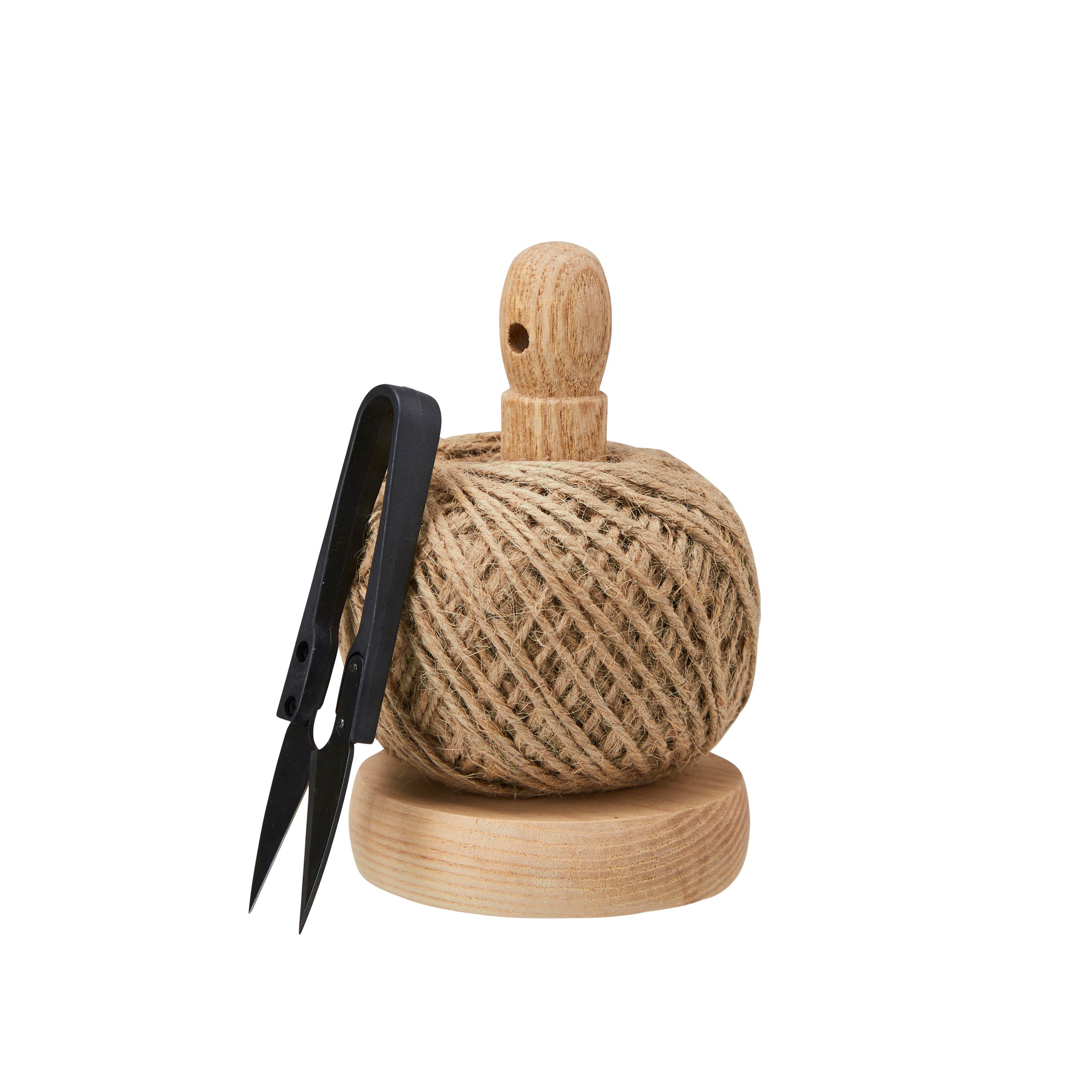 A set with jute twine and scissors, handy to keep close when working in the garden. The twine sits on a wooden holder and comes with a small pair of scissors, making it easy to cut the length you need when tying up plants or binding bouquets.