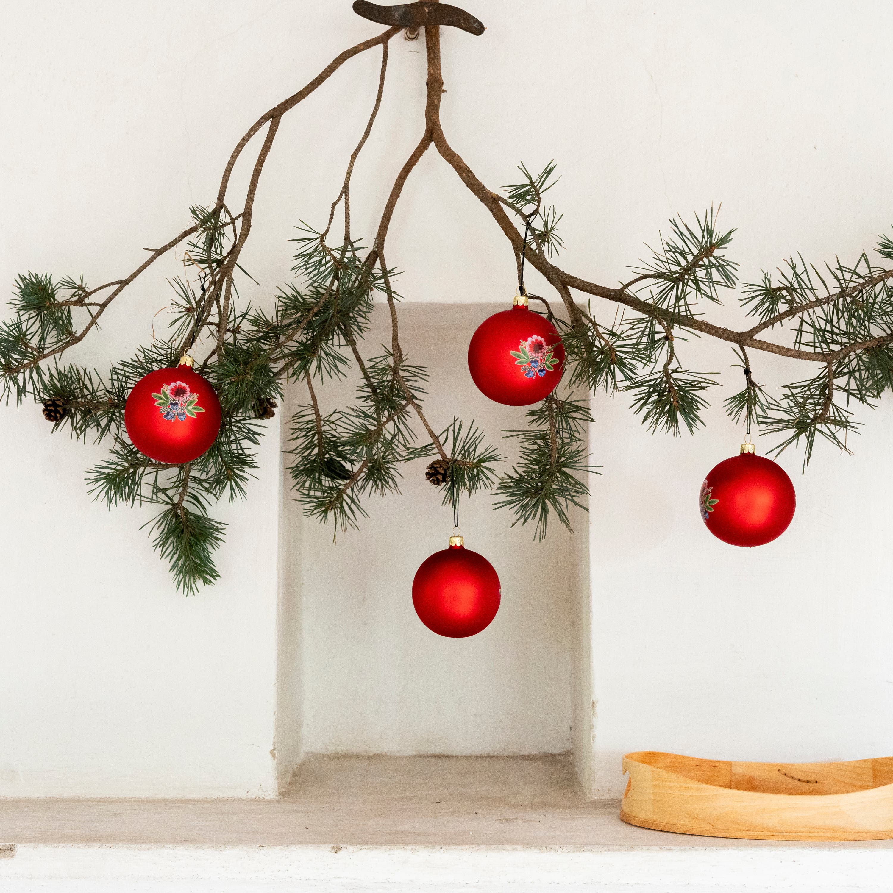 A red glass Christmas ornament featuring a floral pattern inspired by the jacket of the Dalafloda folk costume. The design is printed on both sides and is based on the colourful embroidery created with the traditional påsöm technique. The red glass bauble catches the light beautifully among the branches and makes a timeless decoration for the Christmas tree.