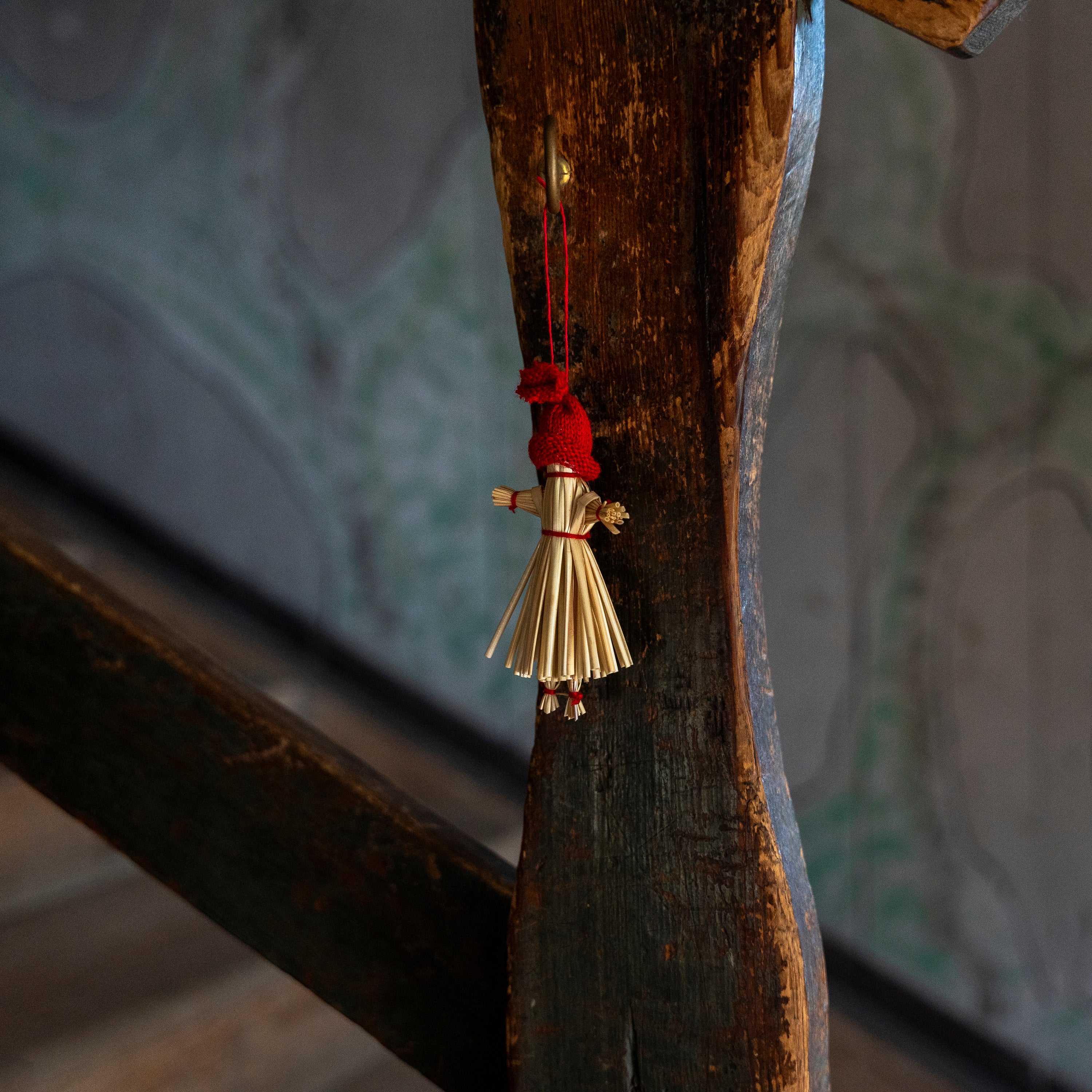 Handmade straw ornament in the shape of a tomte with a red knitted hat. Looks lovely in the Christmas tree or hanging from a knob in the kitchen.