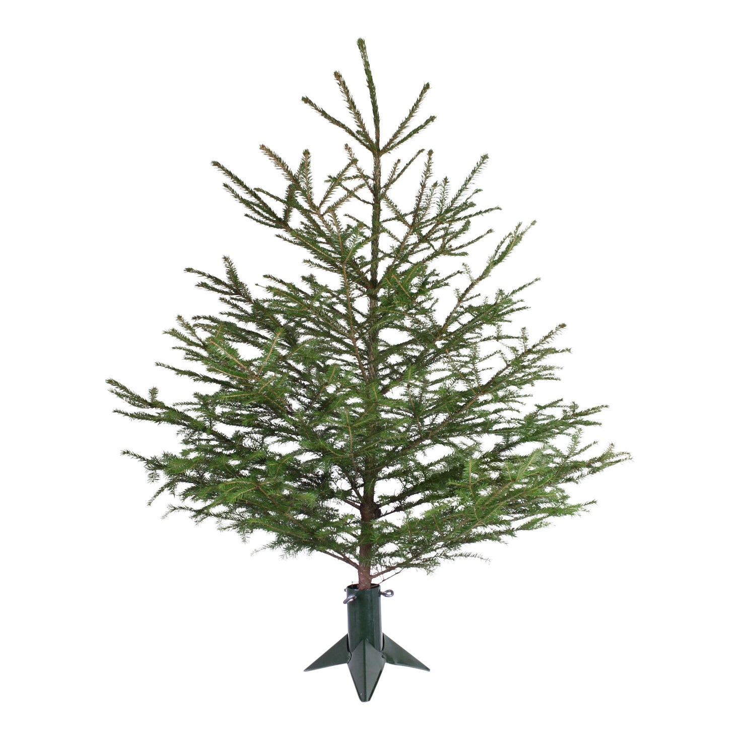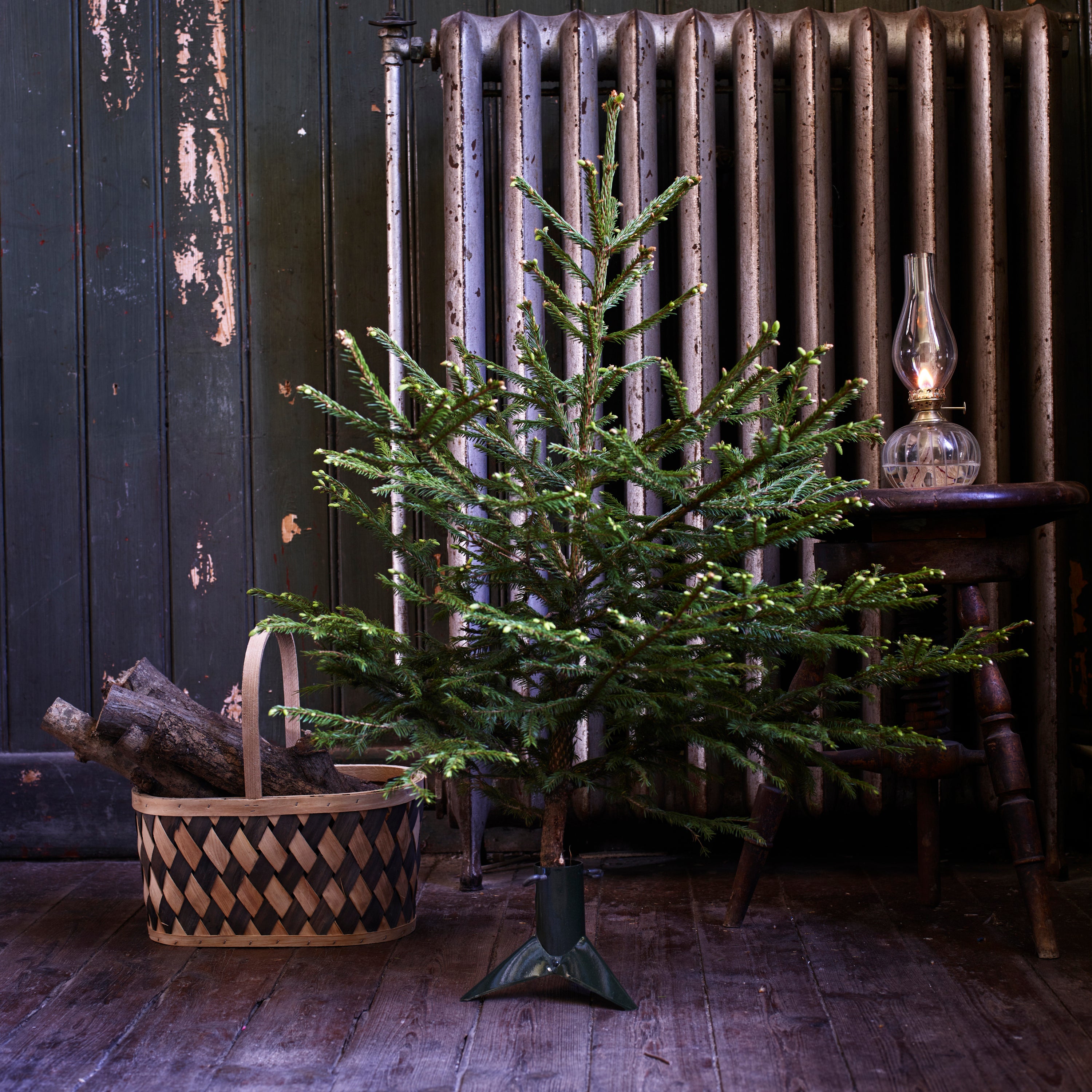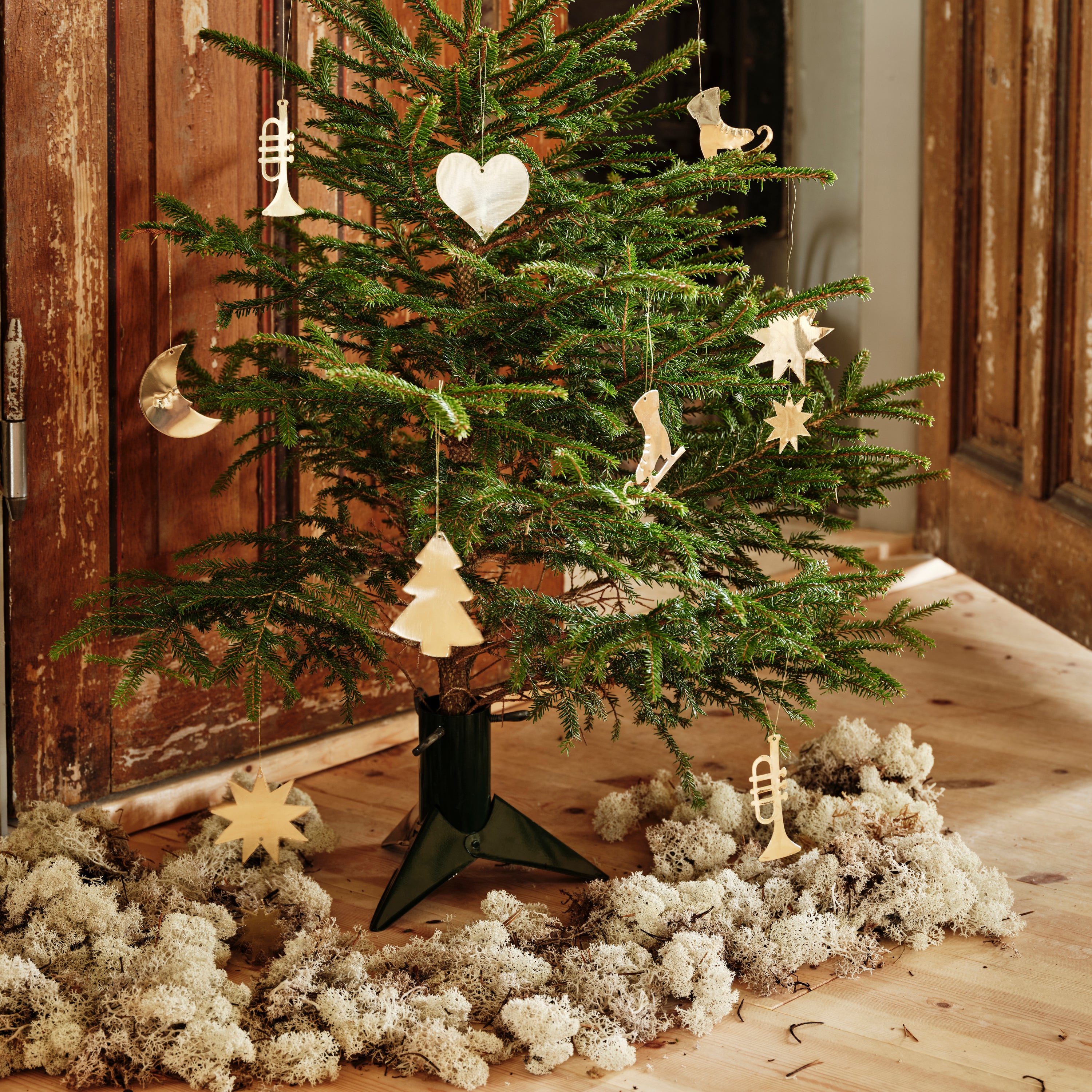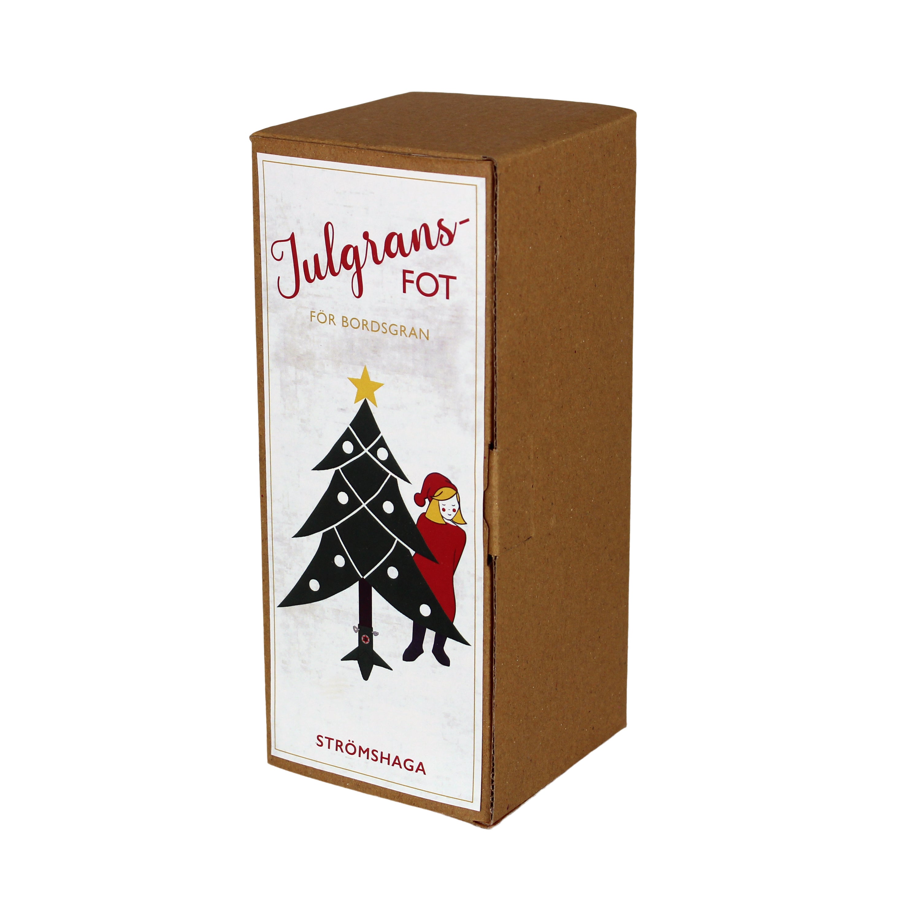 Small Christmas tree stand for tabletop trees, made of green-lacquered metal. Features three screws for securing the trunk.