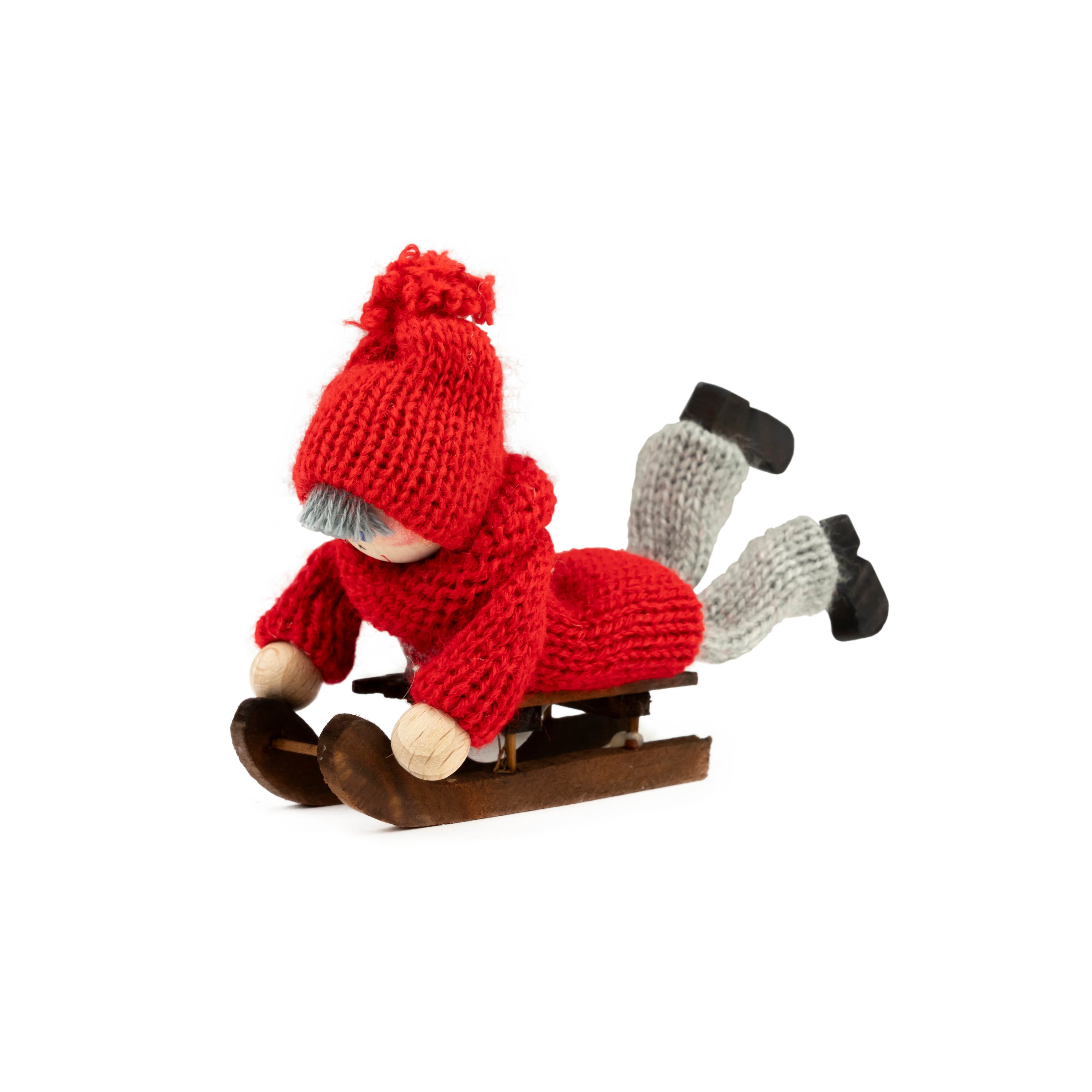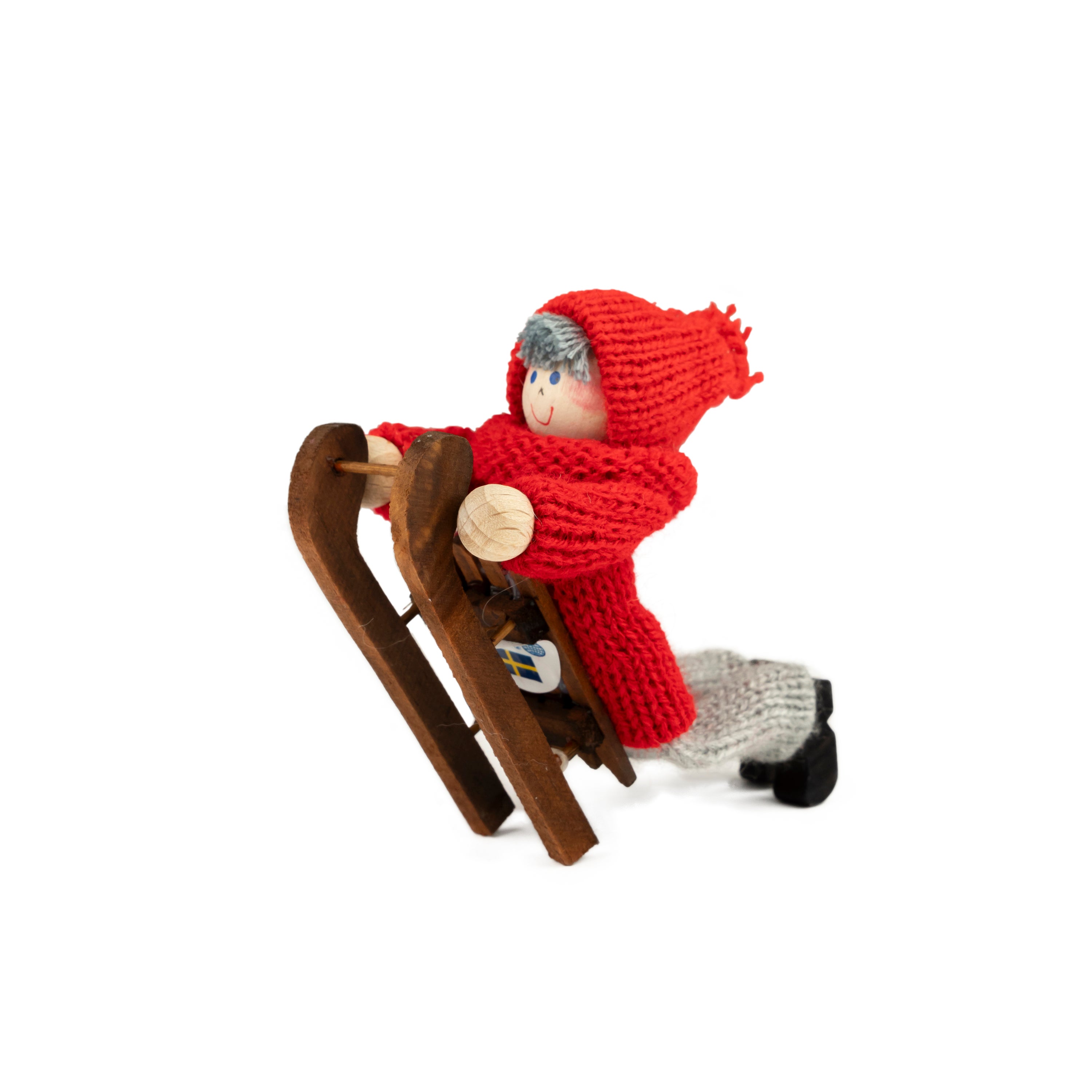 Handmade Santa boy on a sleigh. A charming decoration that brings holiday spirit to your home.