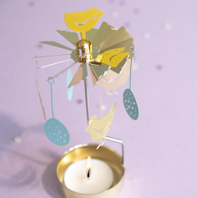 A metal angel chime with hens and eggs that gently spin from candle heat. An Easter decoration that fits nicely on a table, in a window or as part of a table setting.