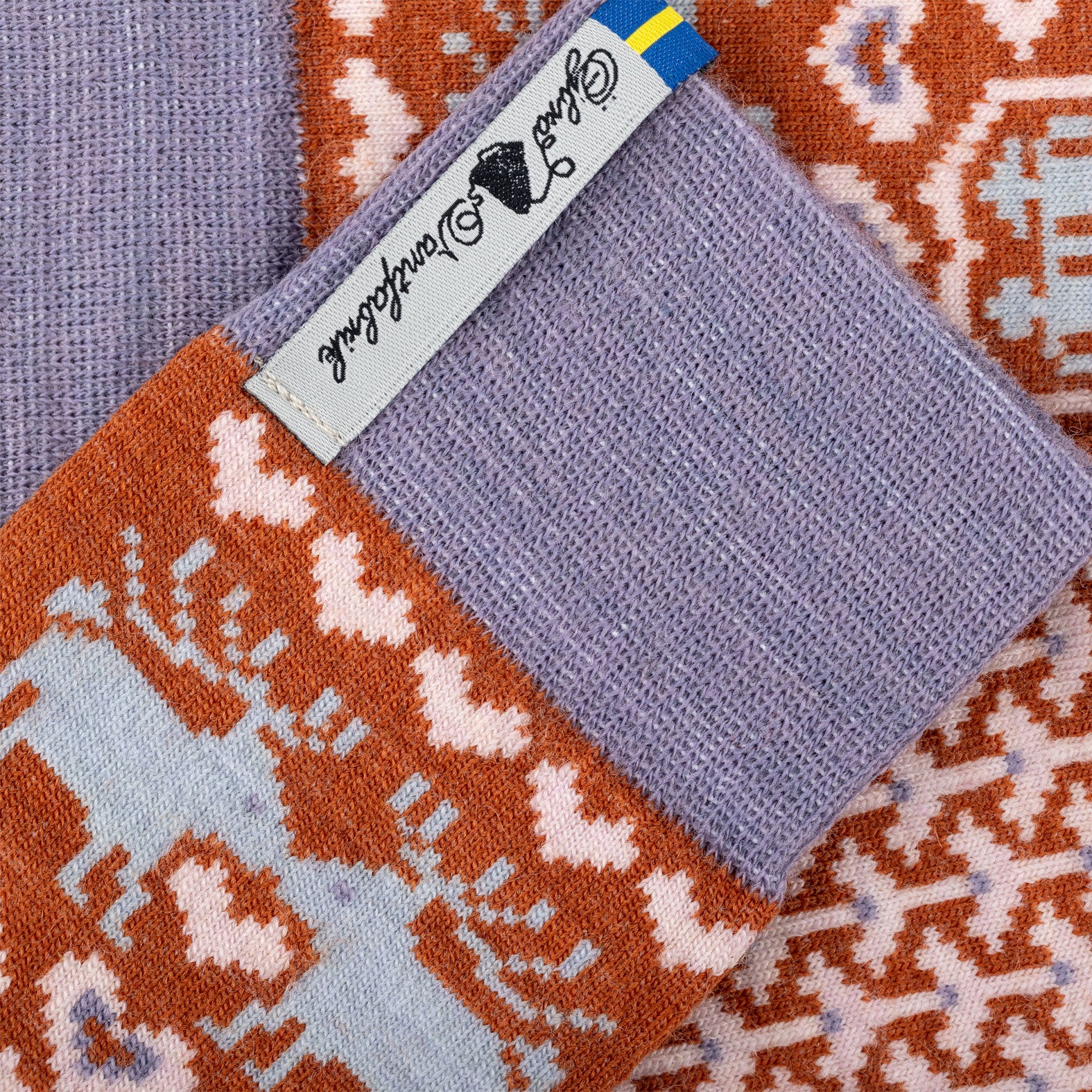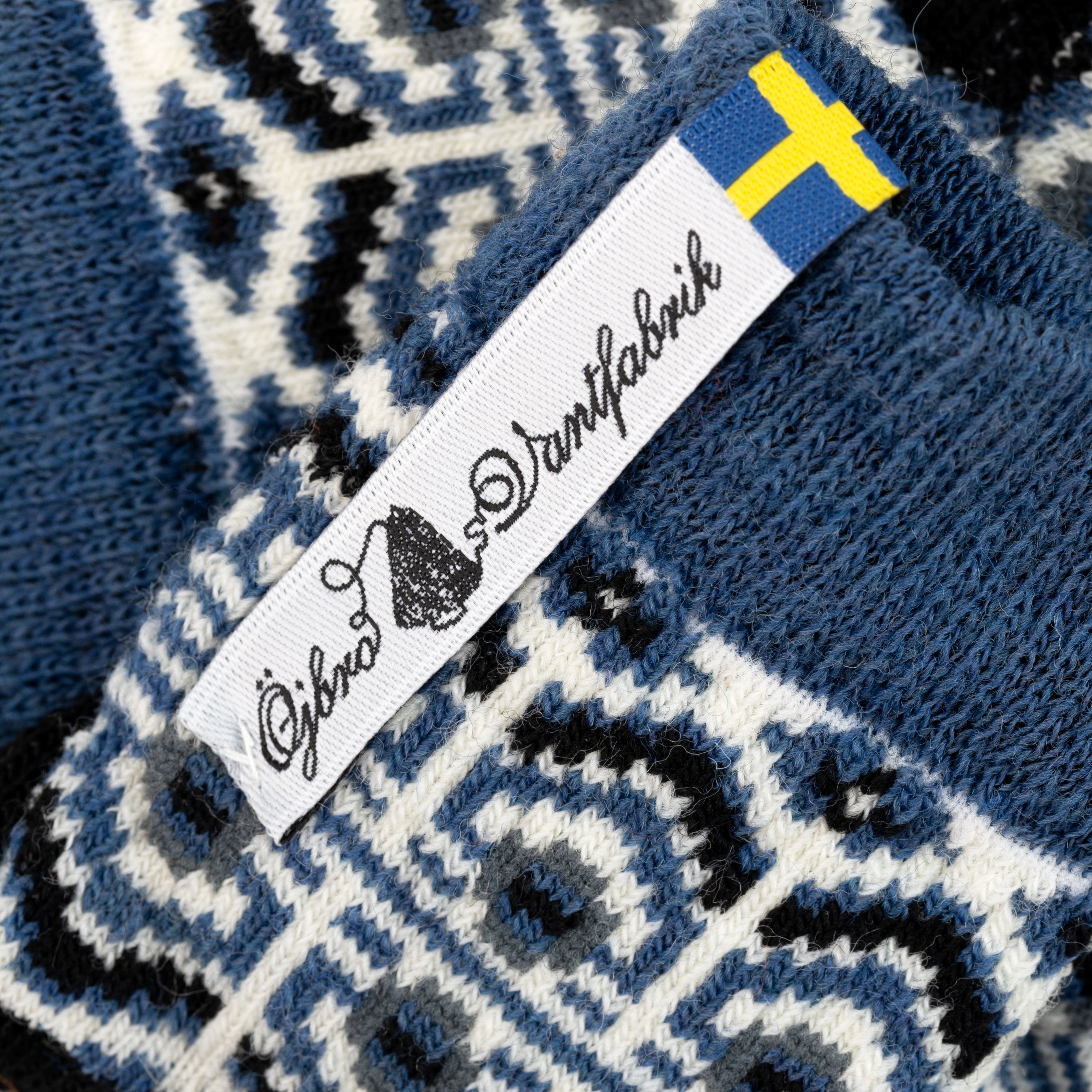 Stickad i Öjbro Vantfabriks egen design ”Dalarna Kurbits”, som är inspirerad av den klassiska kurbitsstilen från Dalarna.