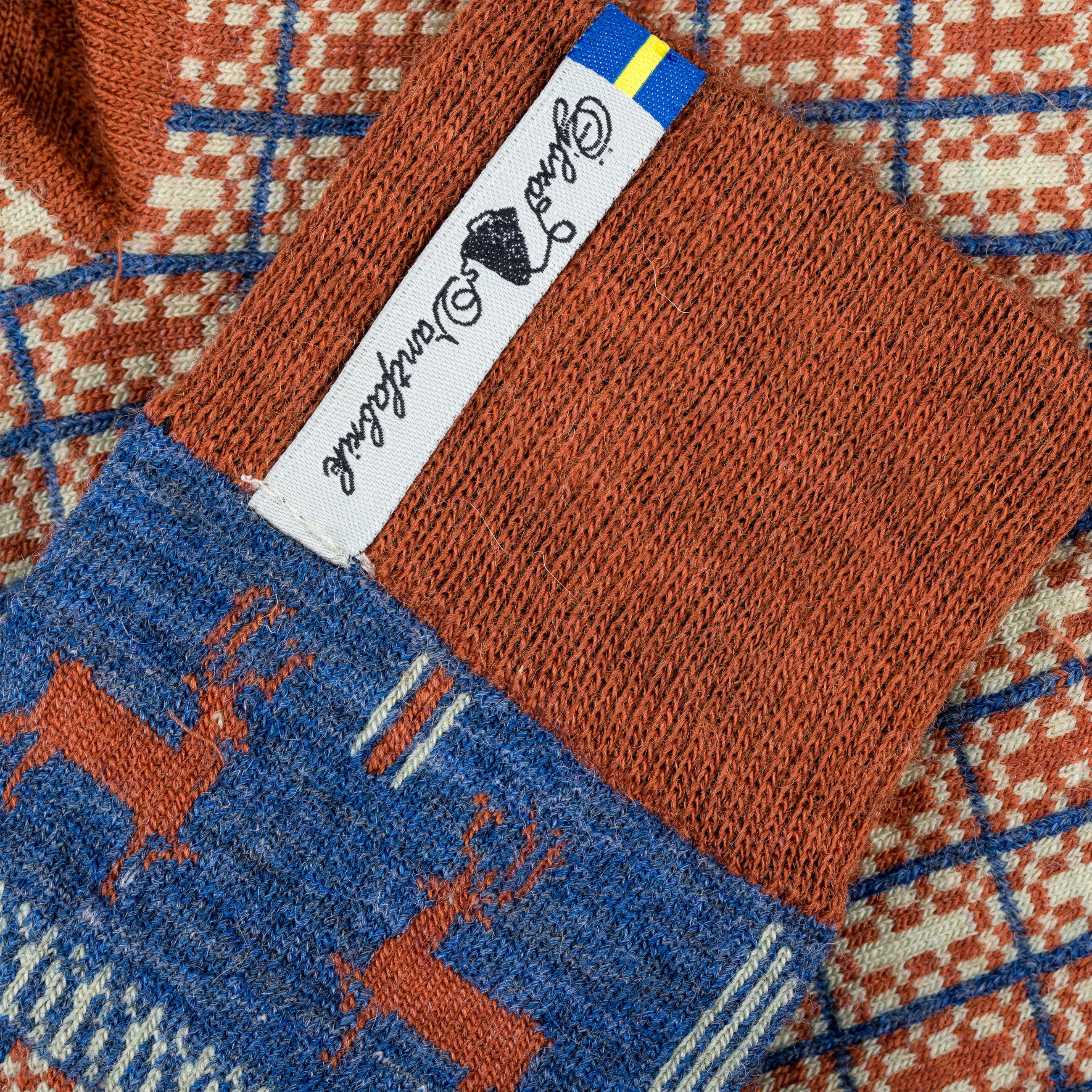 Strumpa i merinoull med ett fint mönster inspirerad av Märta Måås-Fjetterströms livsverk och pryds av Skånes vackra kronhjortar, färgsatta i tidlösa, traditionella färger. Strumporna passar i de flesta skor och håller värmen utan att vara för tjocka. 80% Merinoull ,15 % Polyamid, 5% Lycra