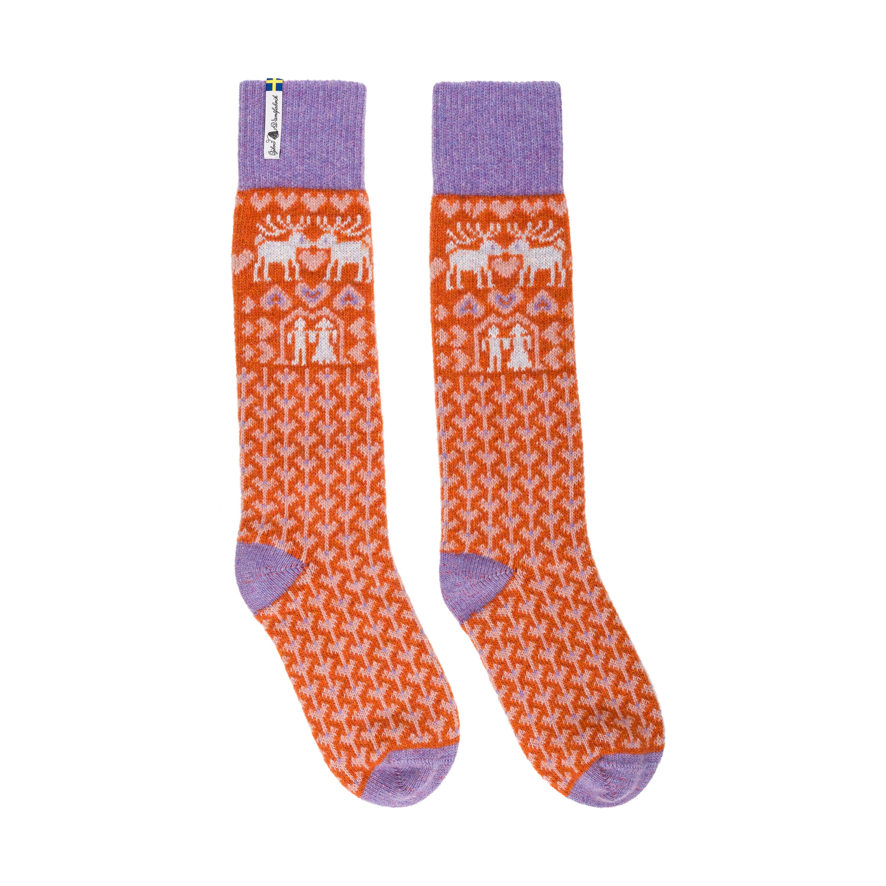 Rejäla och värmande sockor tillverkade av 70% ull. Handstickade i Grönahög, Västergötland, och designade med ett vackert, traditionellt och tidlöst mönster med inspiration från kärlekspar. Sockorna håller dina fötter varma och bekväma även under de allra kallaste vinterdagarna. 70% Ull 25% Polyamid 5% Elastan
