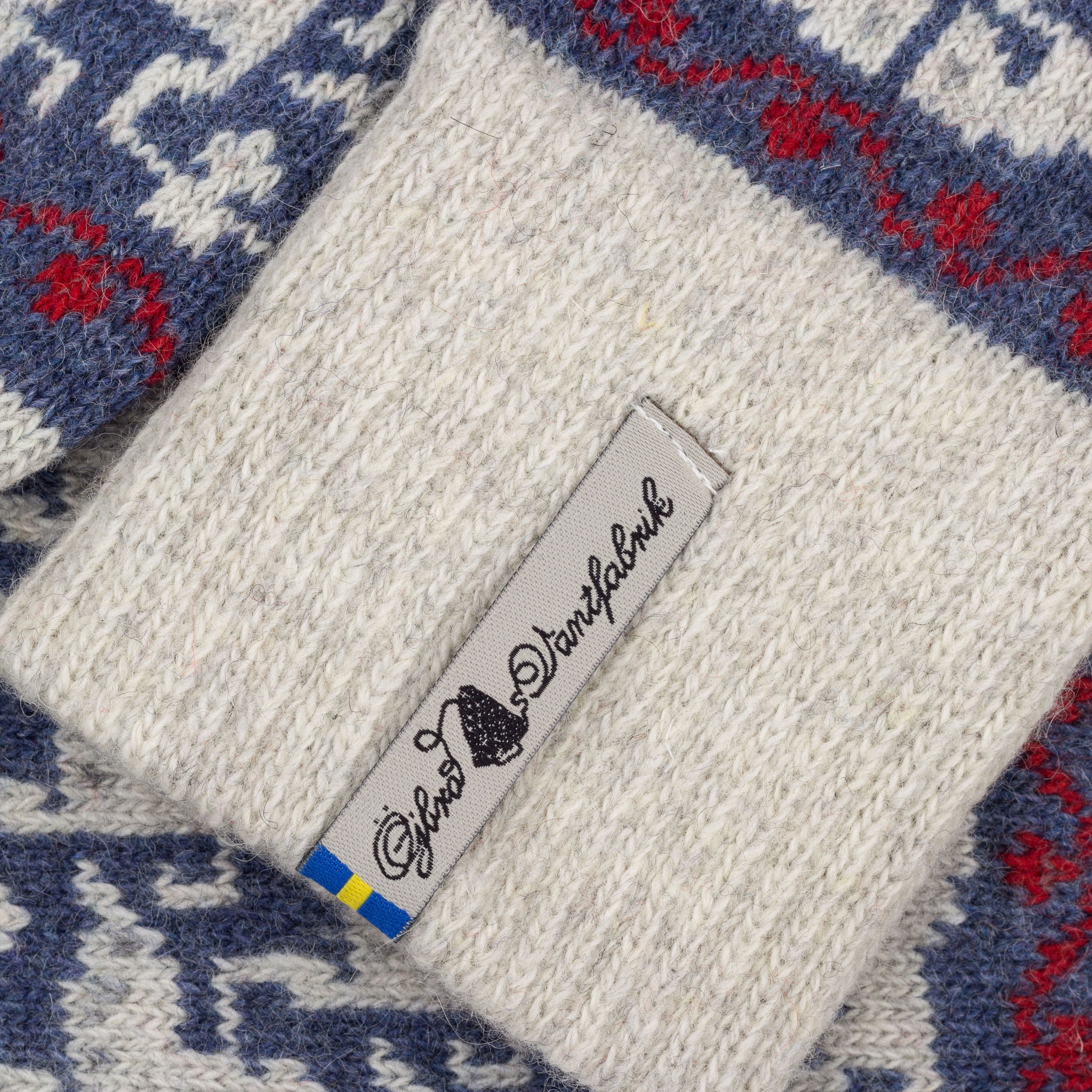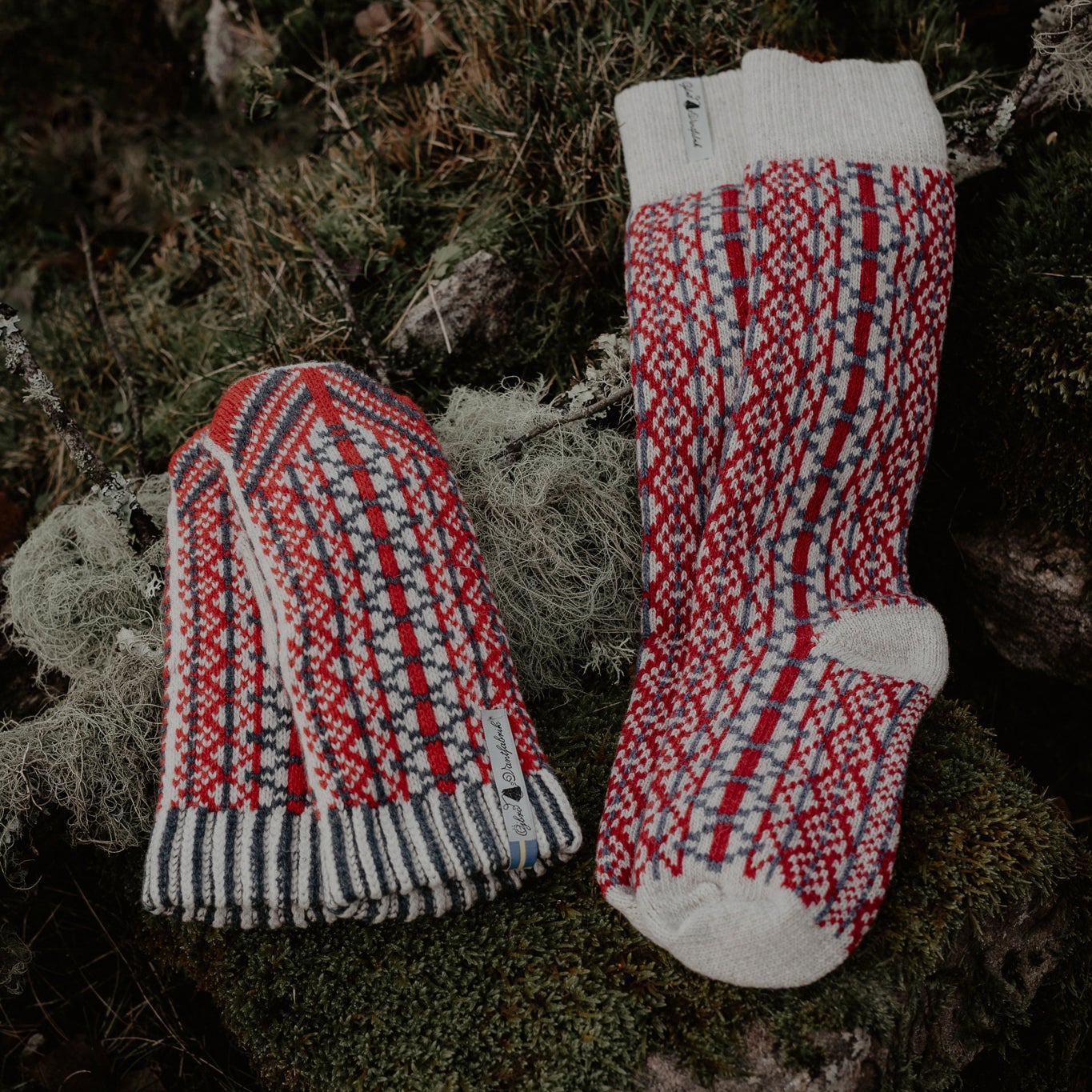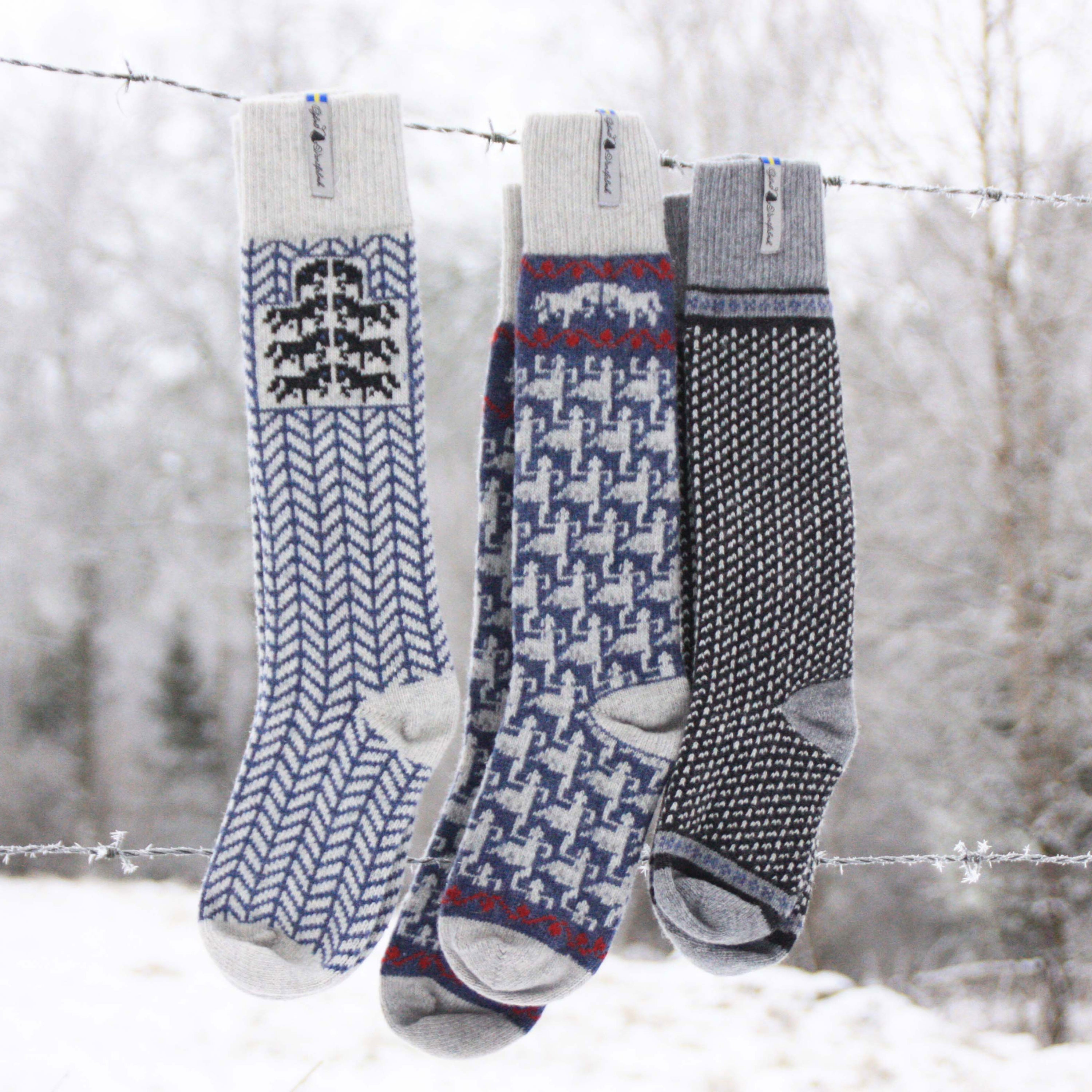 Knähög stickad socka i 70% ull med ett mönster inspirerat av visan "Jungfrun hon går i ringen". Sockorna håller dina fötter varma och sköna, även under de allra kallaste vinterdagarna. Övrigt material: 25% Polyamaid och 5% Elastan.