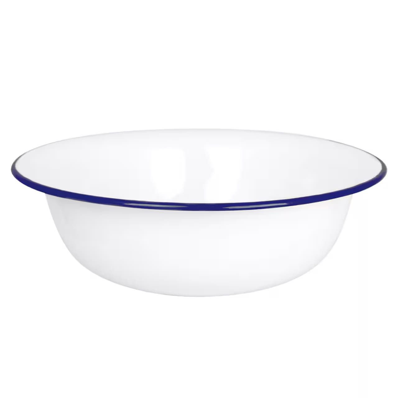 Stort handfat i klassisk, gammaldags stil, tillverkat av vit emalj med en blå kant. Perfekt för ett avkopplande fotbad, som diskbalja i uteköket eller i sommarstugan. En nostalgisk detalj som passar fint i en klassisk, lantlig miljö.