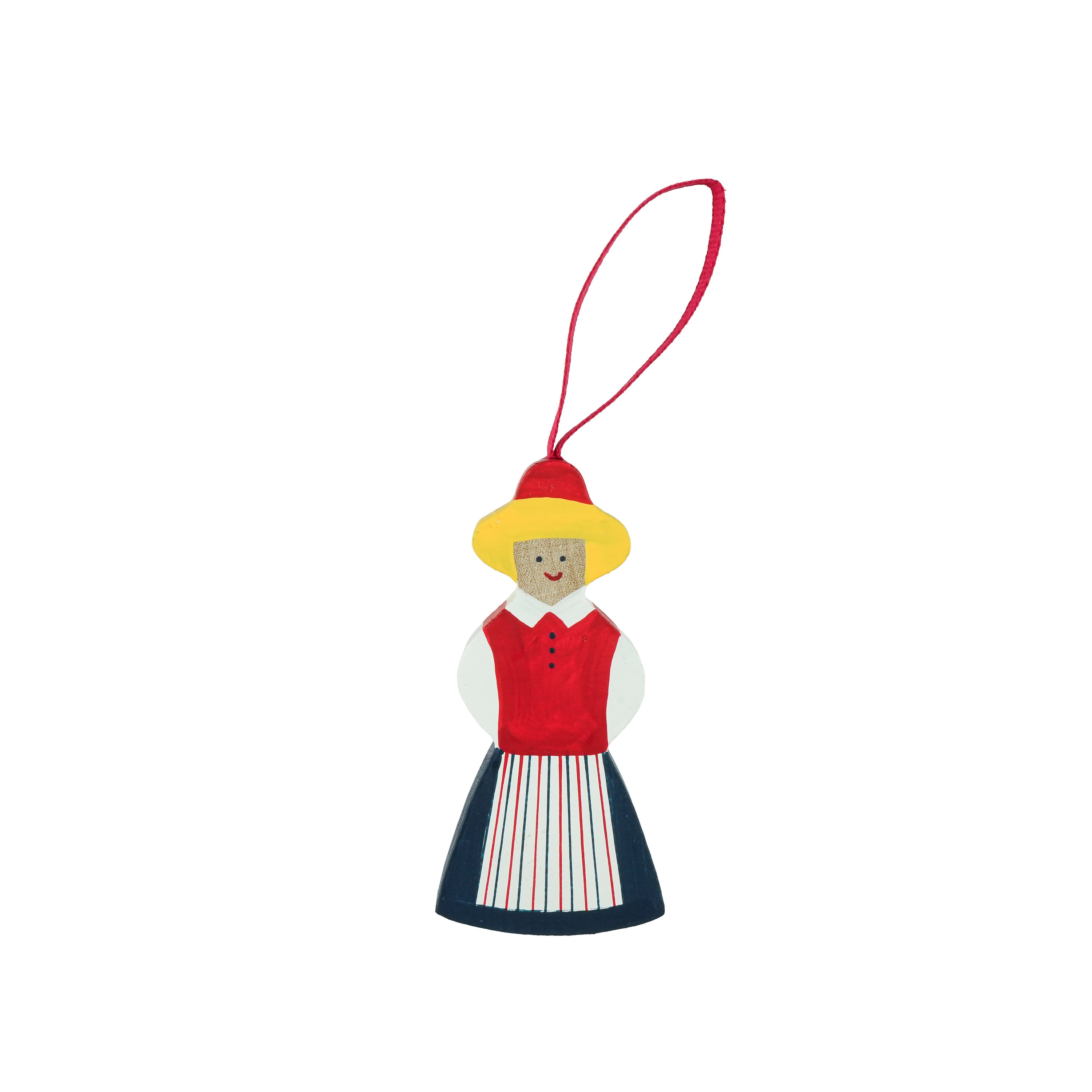 Ett målat trähänge som föreställer en kvinna i folkdräkt med röd väst och randigt förkläde. En färgstark liten figur som blir ett roligt inslag i granen eller som dekoration året om.