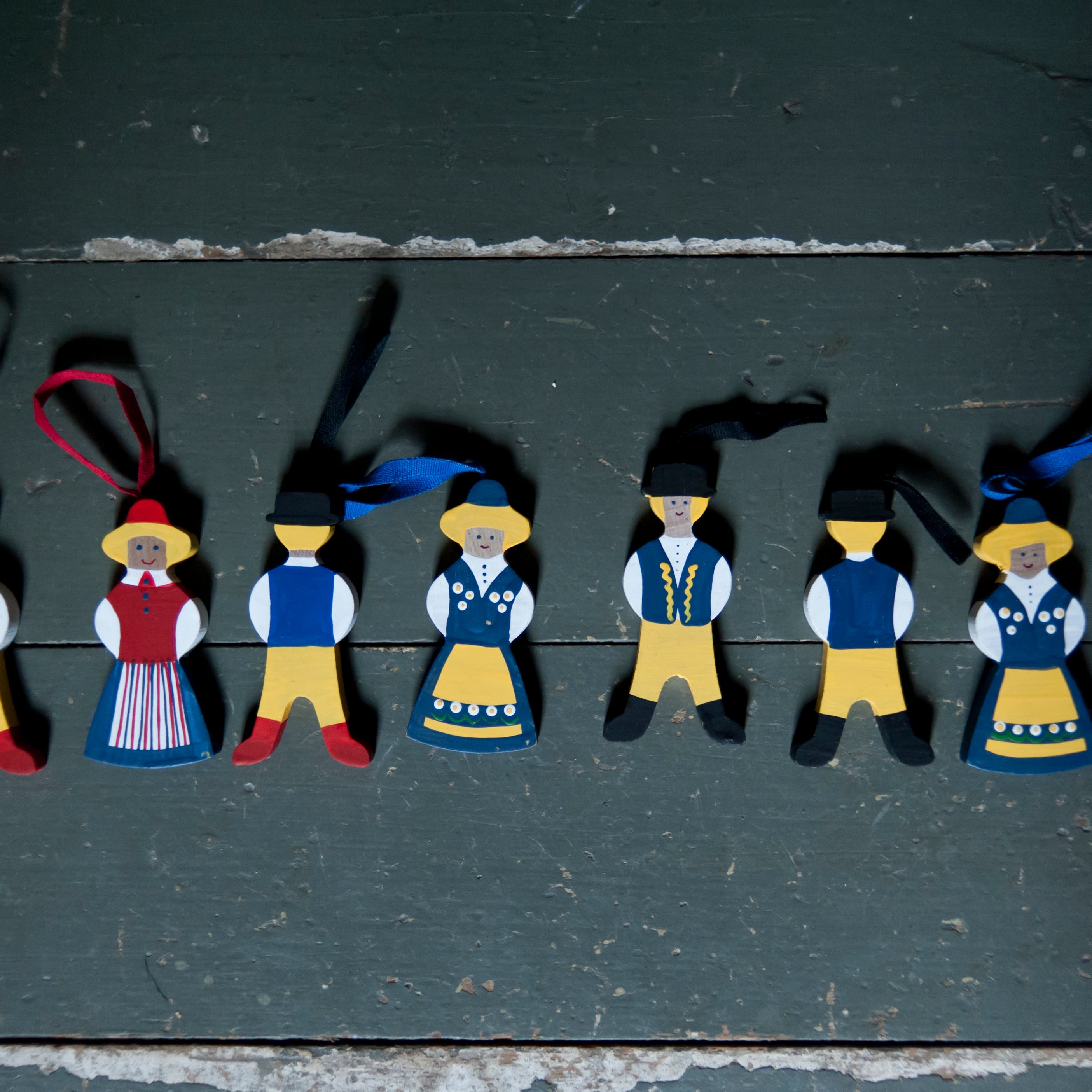 Hänge i trä som föreställer en far i Sverigedräkt, handmålad dekor i blått och gult. Passar både vid högtider och som dekoration året om. Fin för sig själv, men allra bäst tillsammans med mor.