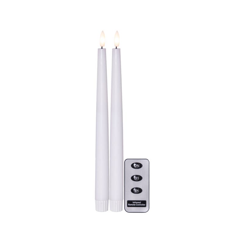 Ett set med två stilrena LED-antikljus som sprider ett naturtroget sken och ger samma stämning som levande ljus men utan brandrisk eller stearinspill. Ljusen är 28 cm höga med slät yta och en fladdrande låga som ger ett varmt och inbjudande sken på middagsbordet, i fönstret eller i en ljusstake.