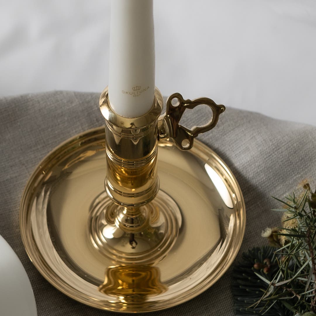 Kontorsljusstaken har för många blivit Skultunas signum och har varit i oavbruten produktion sedan bruket grundades i början av 1600-talet. Den polerade mässingen ger ett tidlöst uttryck som passar lika fint i moderna hem som i mer traditionella miljöer. Ljusstaken har en genomtänkt funktion med en justerbar nyckel på sidan, som gör det möjligt att sänka ljuset allteftersom det brinner. En gång i tiden var detta ett sätt att spara på de dyrbara stearinljusen. En uppskattad present – till dig själv eller någon du tycker om.