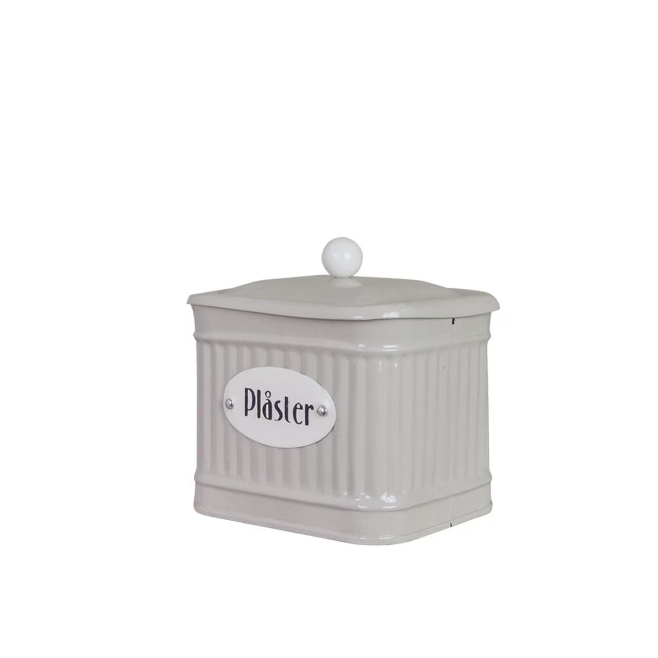 Liten burk för förvaring av plåster och annat smått som kan behövas vid mindre skador. Placera den i badrummet, köket eller hallskåpet så att plåstren alltid finns nära till hands. Den räfflade ytan ger burken ett klassiskt uttryck som passar fint i hemmet.