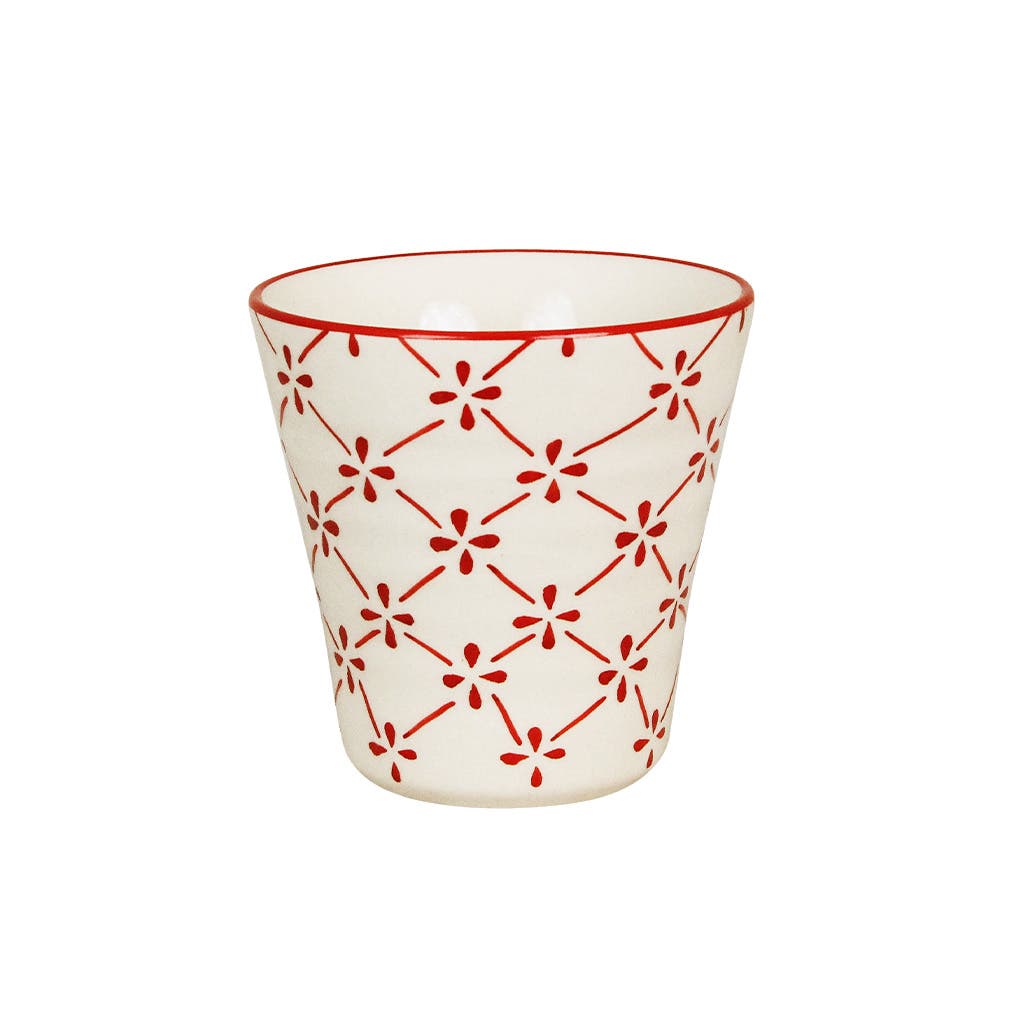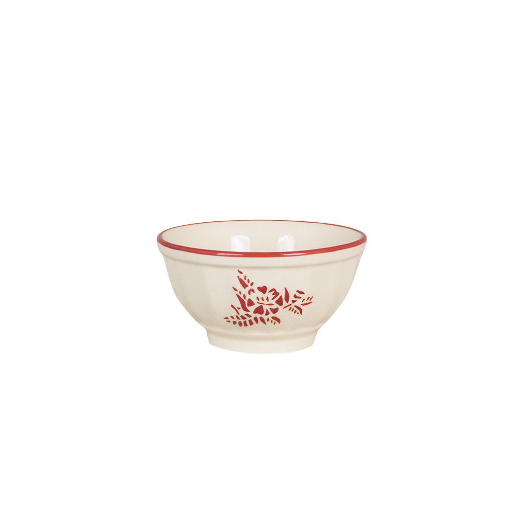 En liten skål i stengods med handmålat, gammaldags blommönster i rött och en målad kant. Mönstret för tankarna till den franska landsbygden och passar fint till juldukningen. Perfekt för julgodis, småkakor eller nötter. Variationer i porslinet kan förekomma. Tål maskindisk och mikrovågsugn. Rymmer ca 27 cl.