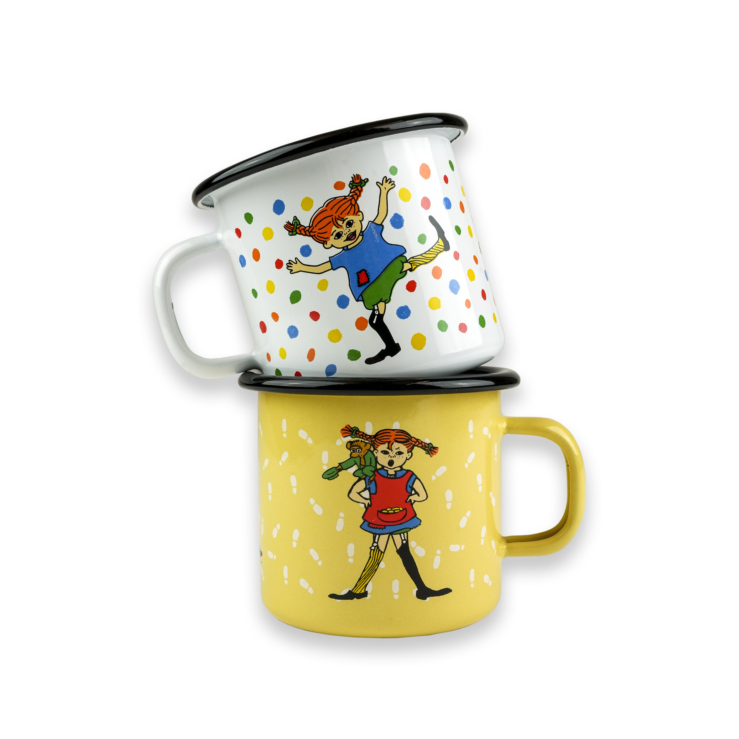 Lekfull emaljmugg med Pippi och färgglada prickar! Tillverkad av kolstål med en slitstark emaljfinish. Perfekt för alla små och stora äventyr, hemma eller på utflykten. En riktig favorit för alla Pippi-fans!