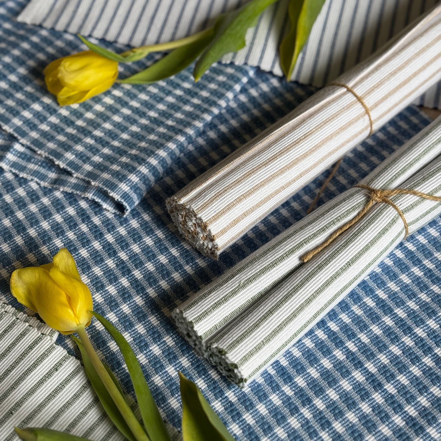 Randig bordstablett tillverkad av 99 % återvunnet material där blandningen av bomull och polyester ger en slitstark och lättskött yta. De smala ränderna ger ett levande men lugnt uttryck som passar fint till både vardagens middagar och snabba frukostar.