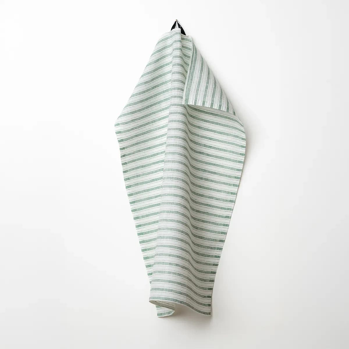 En kökshandduk i grönt och vitt med tunna linjer som ger ett livfullt men tidlöst uttryck i köket. Den lätta linnestrukturen gör handduken både slitstark och mycket absorberande. Den fungerar utmärkt för att torka glas och porslin, men också för händer eller att torka av köksbänken. Linet suger snabbt upp fukt och torkar fort igen, vilket gör handduken praktisk i kökets alla sysslor.