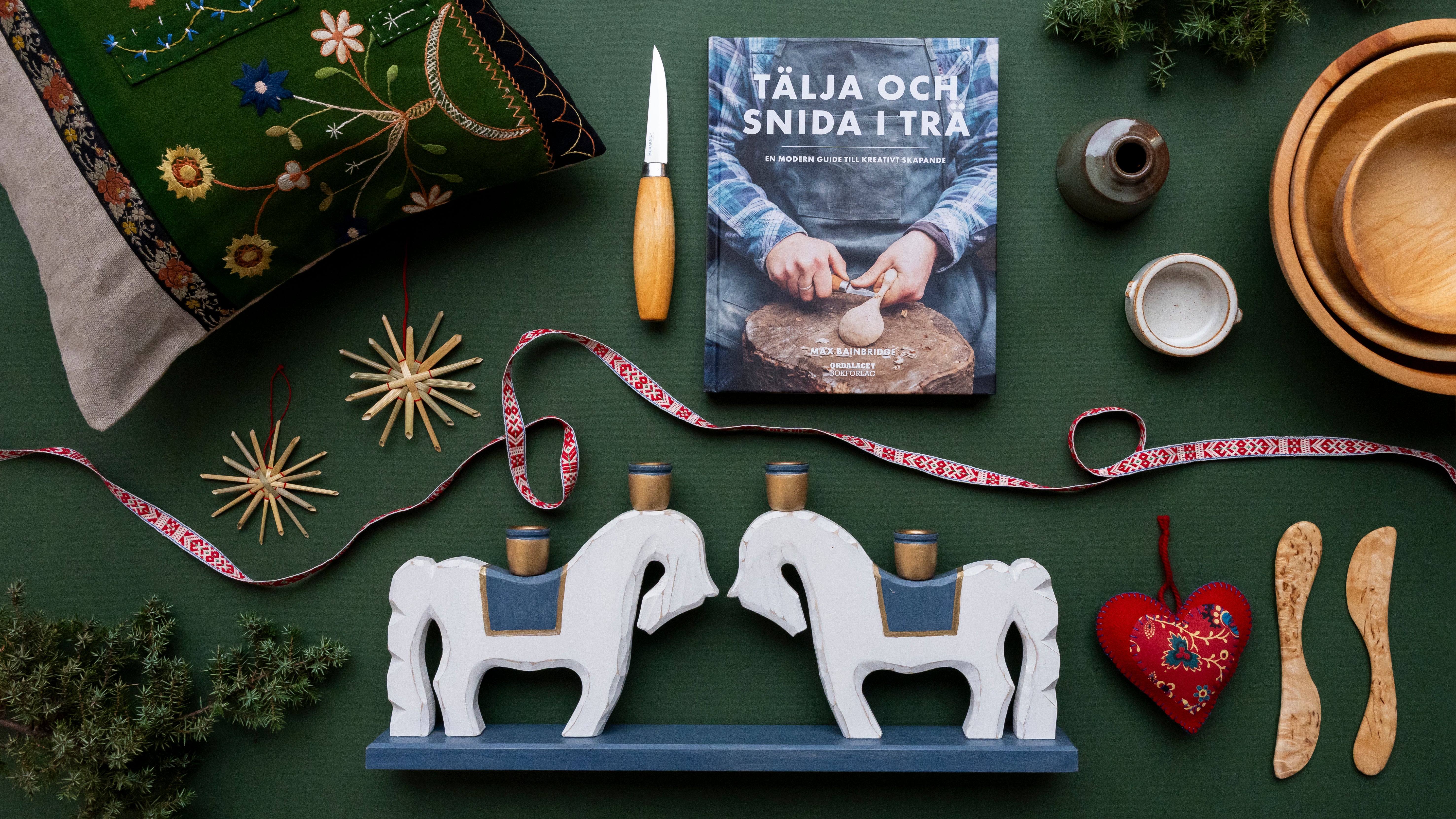 Här samlas handdrejade föremål, vävda textilier, träslöjd och inspirerande böcker för egna projekt, tillsammans med verktyg för den som vill skapa själv. En samling julklappar som bjuder in till både kreativitet och hantverksglädje.