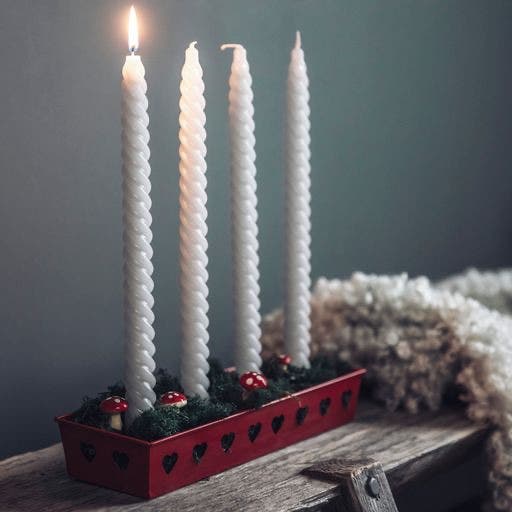 Adventsljusstake i plåt med hjärtan runt kanterna och plats för fyra ljus. Pynta med fin mossa och dekorationssvampar för att skapa en mysig julkänsla. En tidlös ljusstake som du kan använda år efter år. Finns i röd och vit.