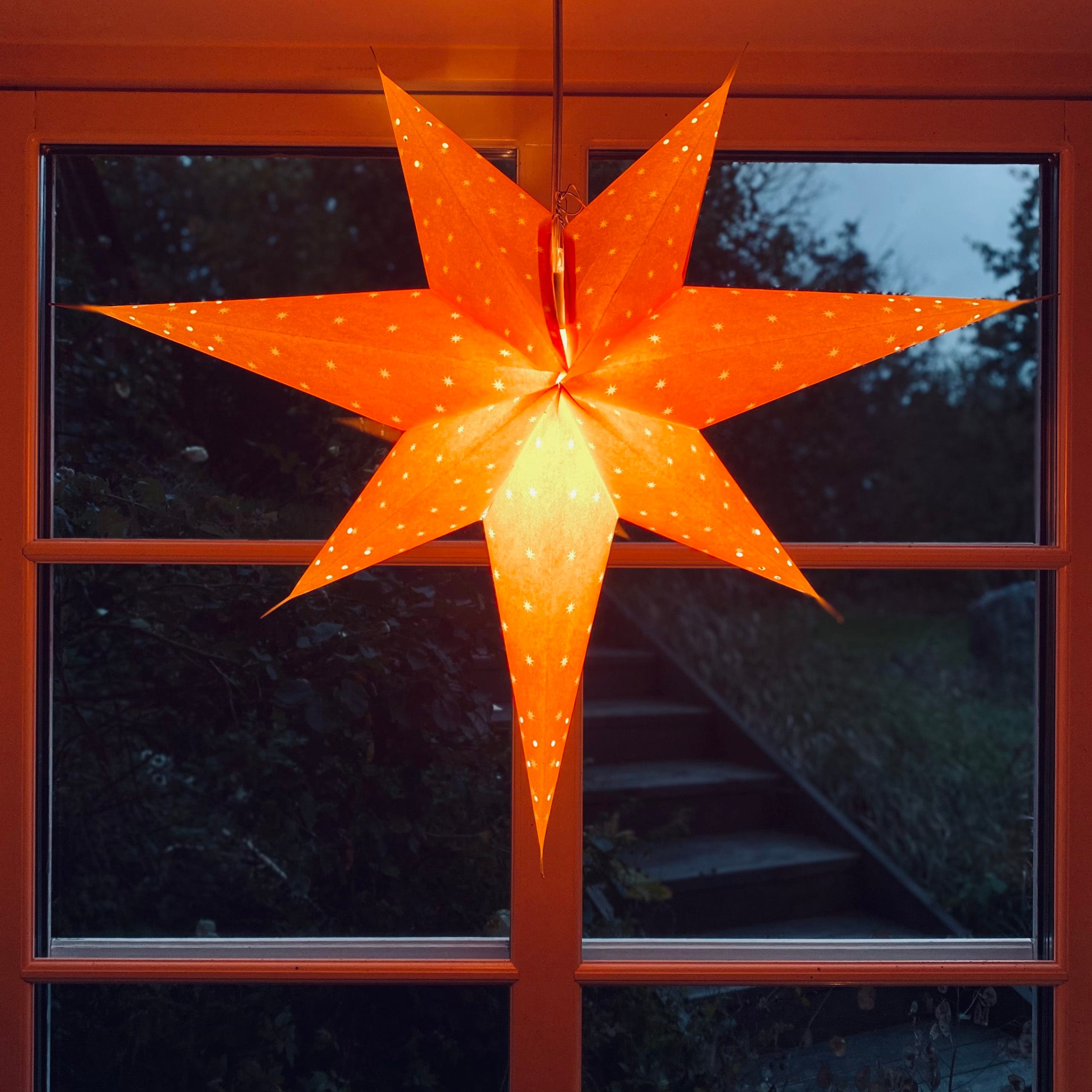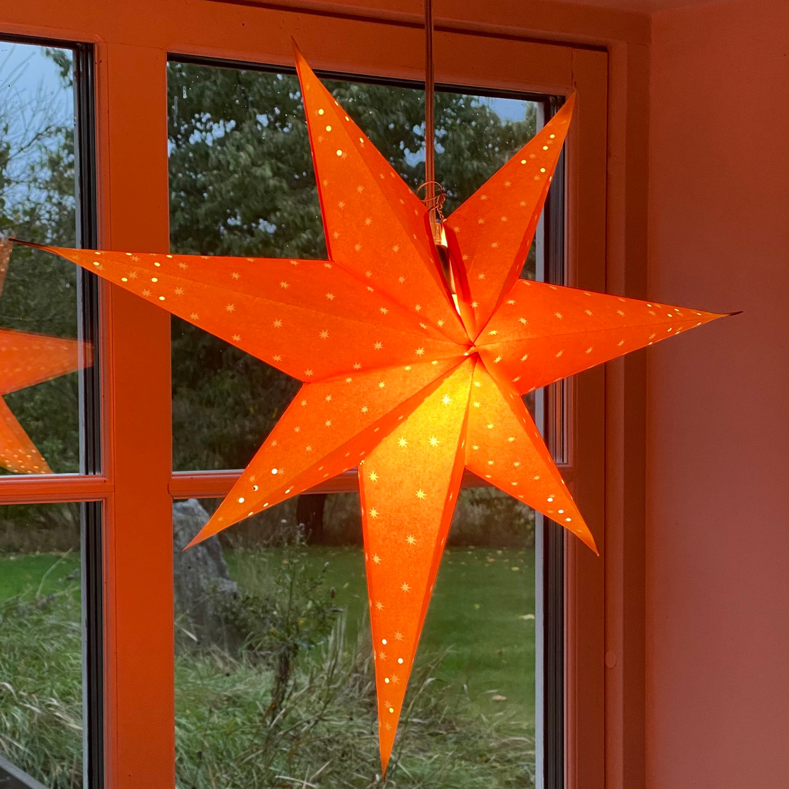 Klassisk, gammaldags och nostalgisk adventsstjärna i gulorange papper. Den ihopfällbara sjuuddiga adventsstjärnan blir ca 60 cm i diameter och har små utskurna hål som låter ljuset silas fram och sprida ett varmt och mjukt sken i rummet. Enkel att veckla ut inför advent, för att sedan vikas ihop och sparas till nästa år.