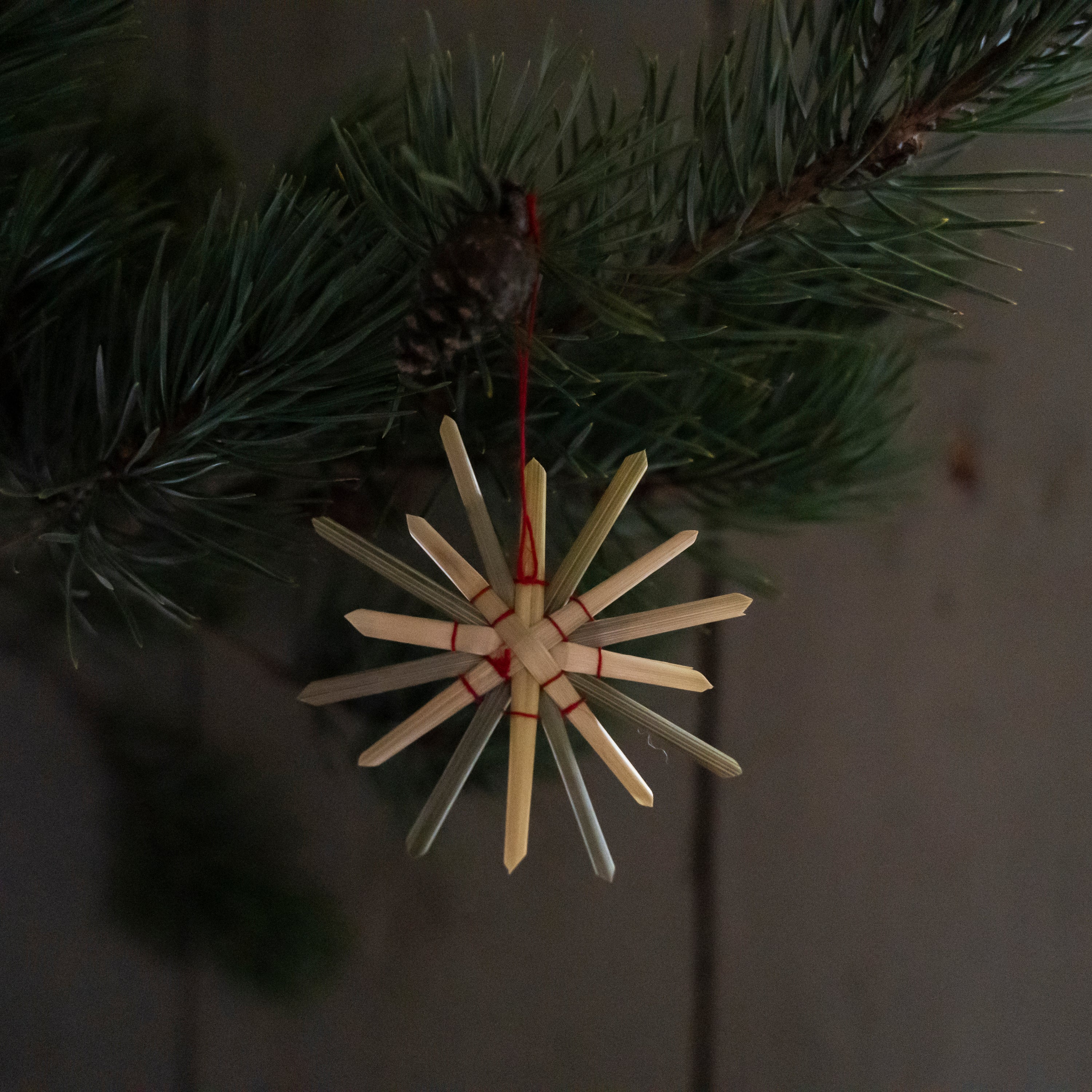 Ett litet handgjort halmhänge i form av en stjärna, bundet med röd tråd. En tidlös julprydnad som ger granen ett naturligt och traditionellt uttryck.