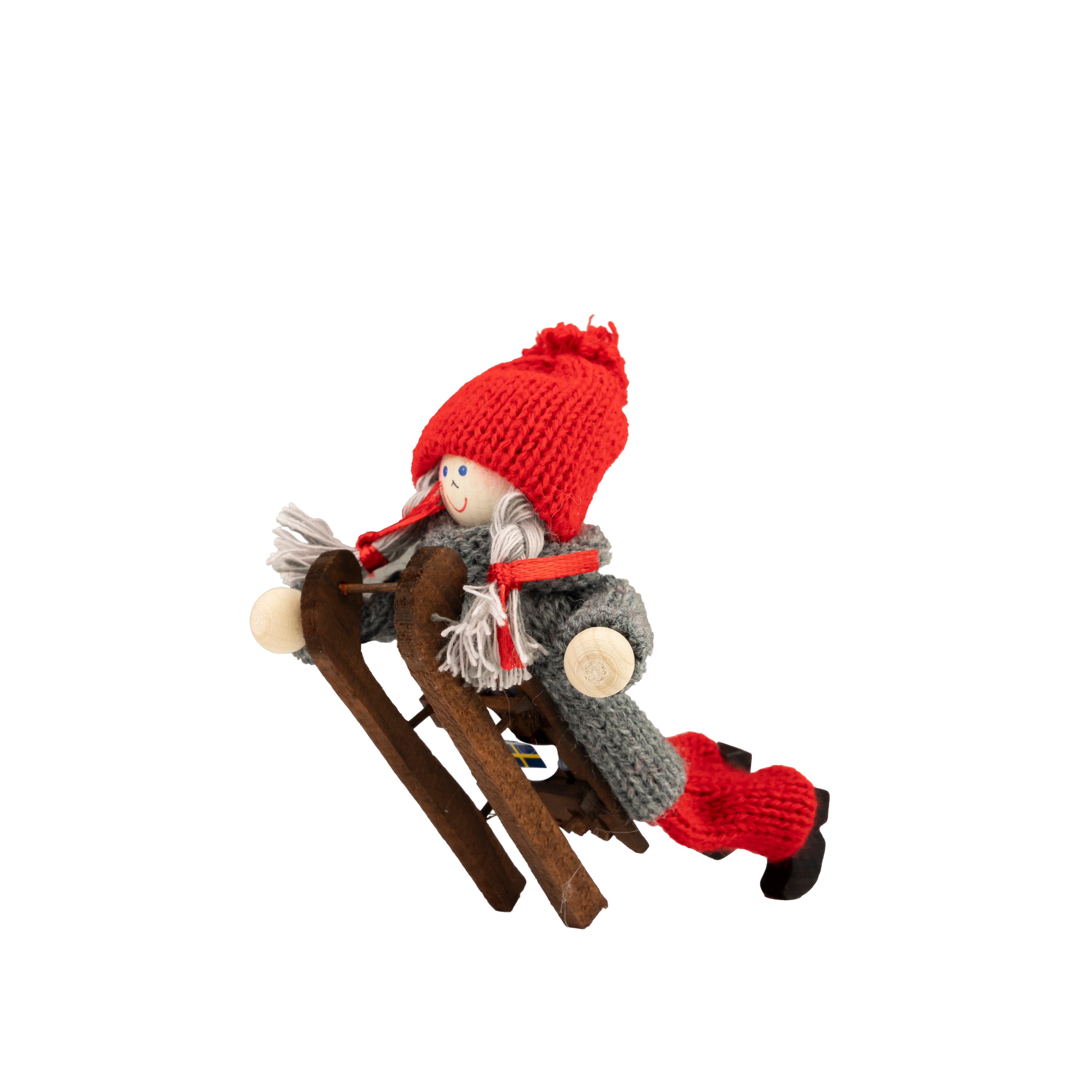 Två små tomtar i en liten korg. Häng dem i granen eller ett fönster, eller låt dem stå som de är.
