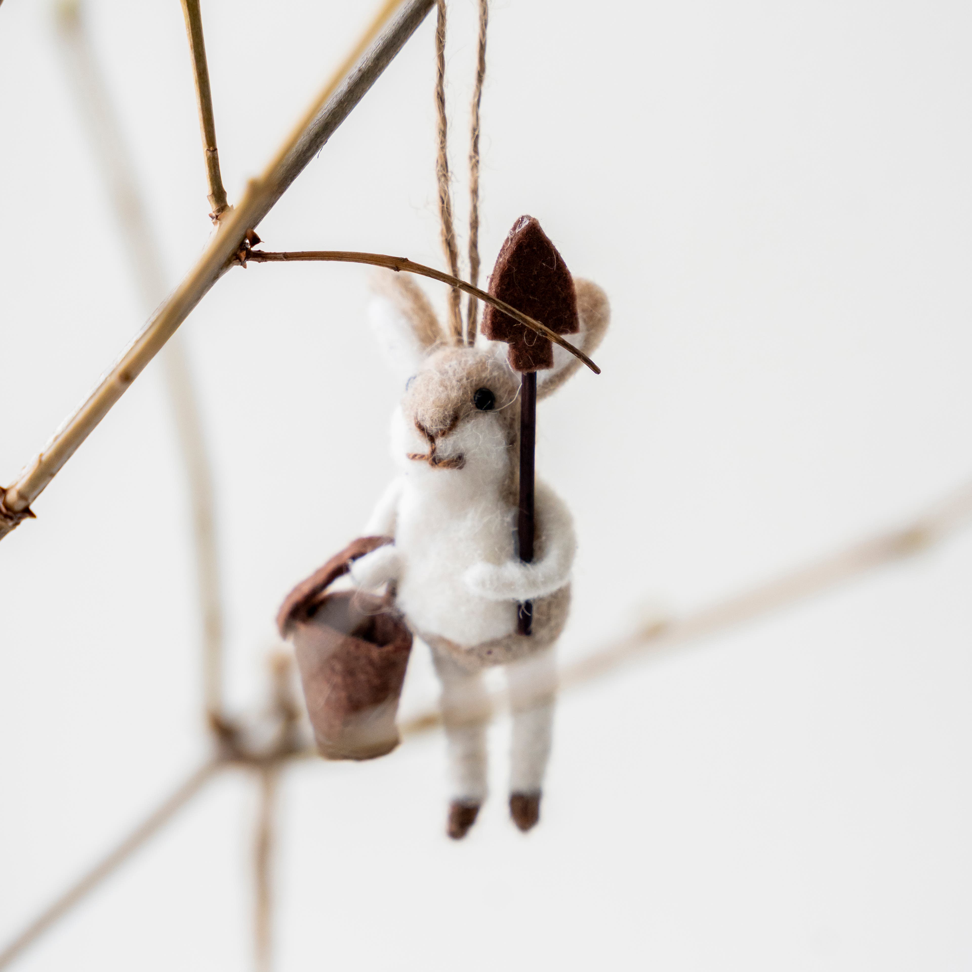 Ett handgjort hänge i tovad ull, format som en liten hare med sin morot. Det lekfulla uttrycket gör hänget till ett fint inslag i påskriset, i fönstret eller på en gren. Eftersom varje hare är handgjord kan små variationer förekomma.