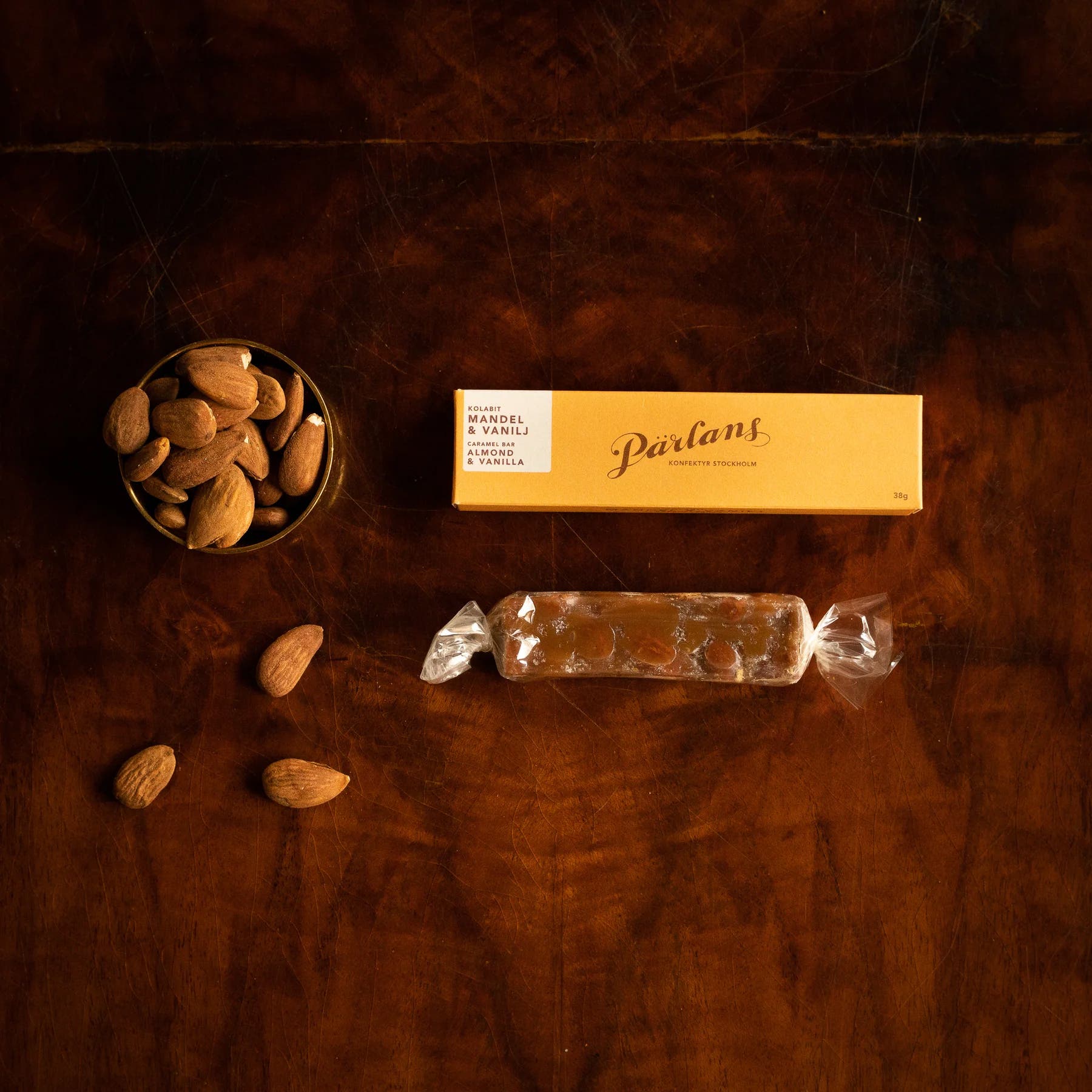 En större handinslagen kola från Pärlans med en len kombination av bourbonvanilj och crunchiga bitar av rostade, salta spanska mandlar. Perfekt att dela med någon eller njuta av själv. En otrolig kombination av sött och salt!