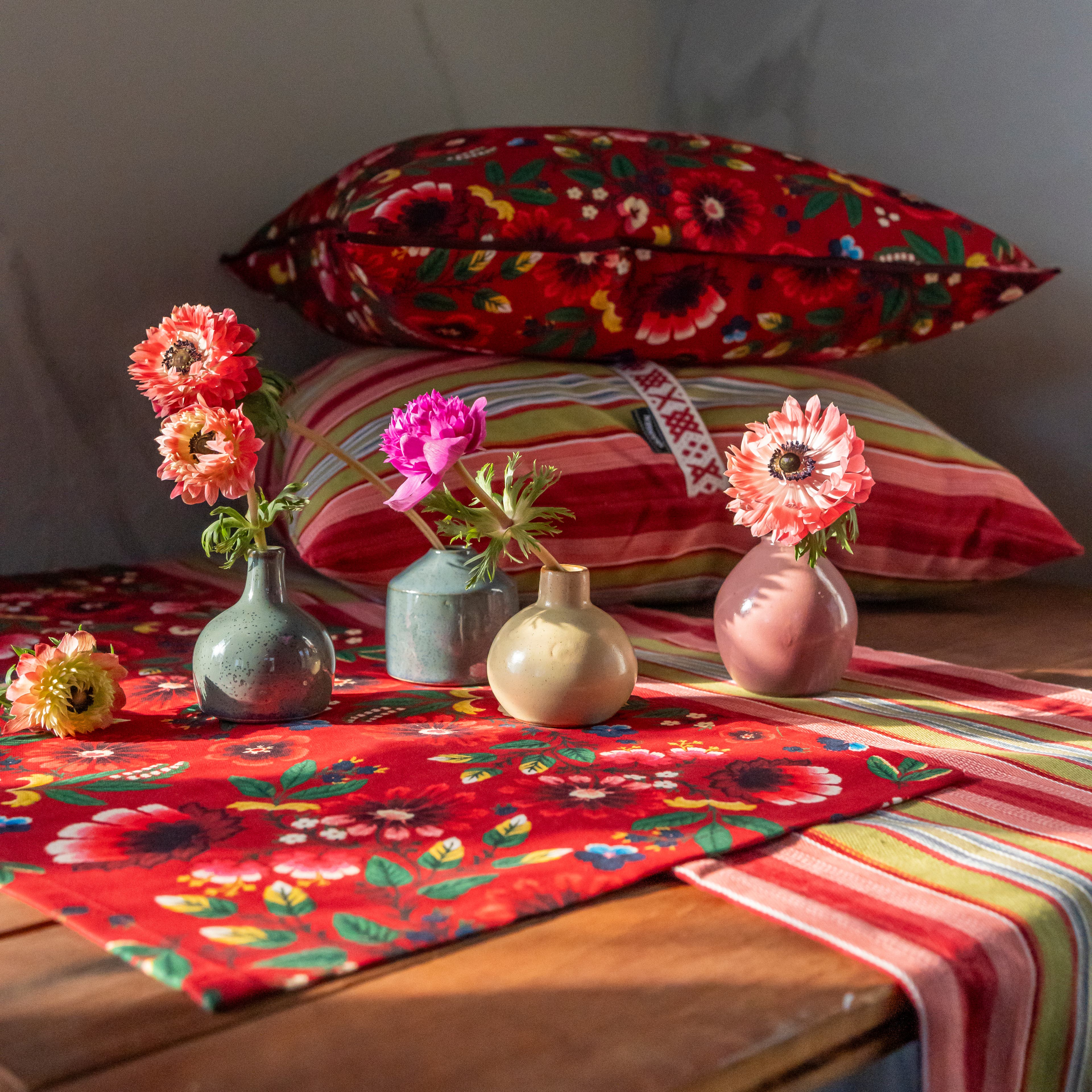 Härifrån har bland annat mönstret Dalafloda vuxit fram, inspirerat av folkdräkten med samma namn. I kollektionen hittar du vackra textilier som kuddfodral, dukar, handdukar och andra textilier för hemmet, designade för att passa både moderna hem och miljöer där det traditionella får ta plats.