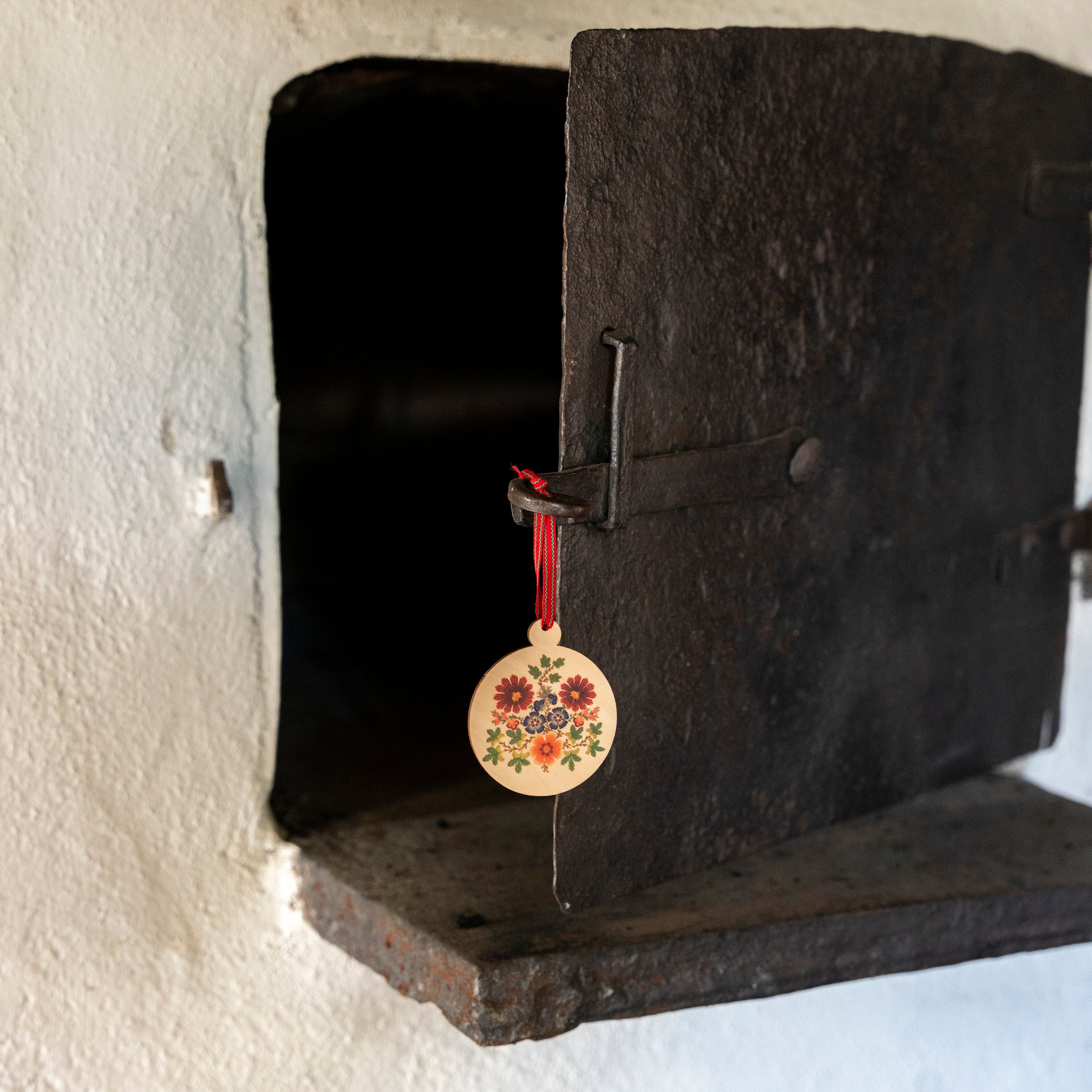 Dekorativt trähänge som pryds av blommönstret hämtat från jackan i Dalafloda folkdräkt. Passar lika fint i granen som i fönstret – eller som en liten detalj på ett paket.