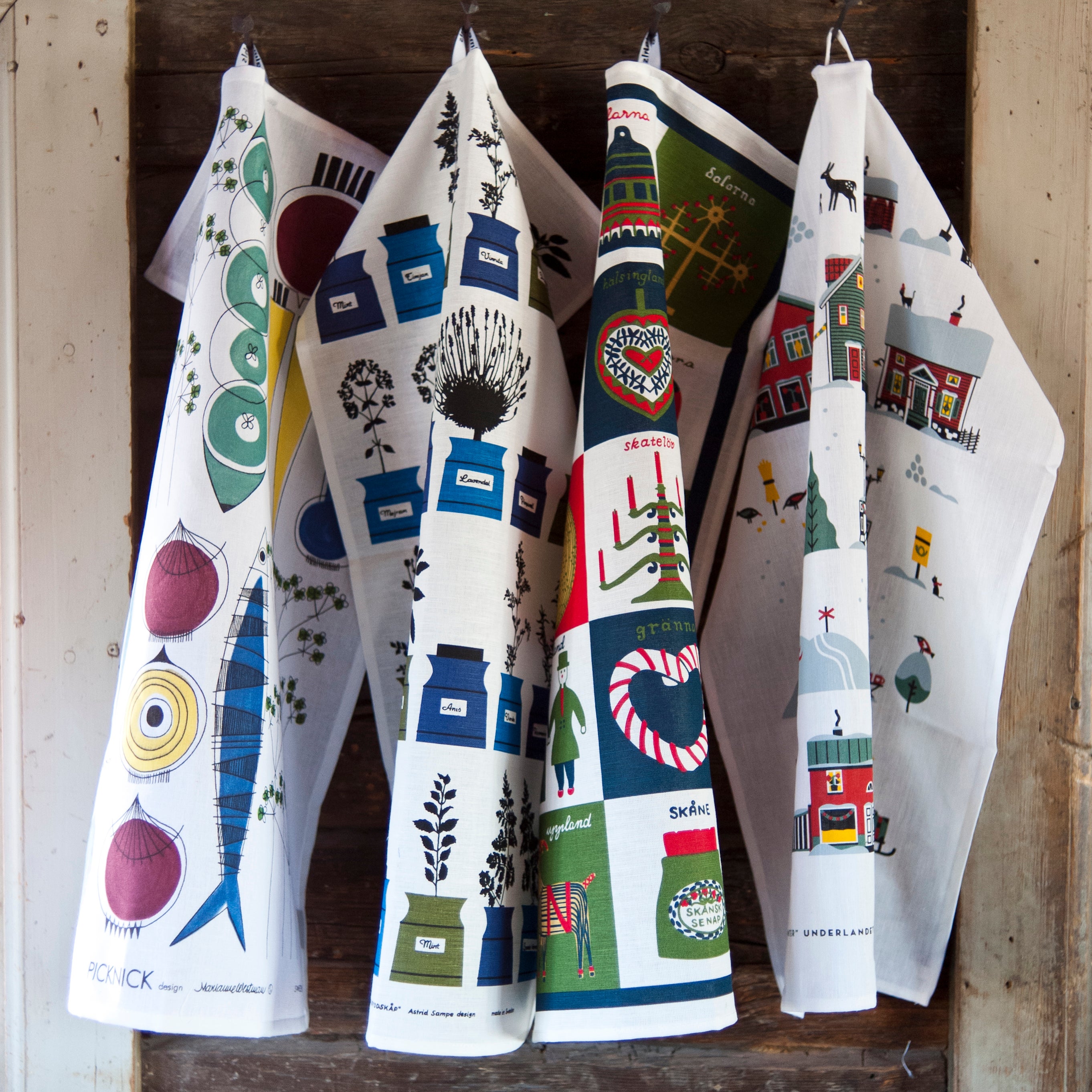 Kökshandduk från anrika Almedahls med ett vackert landskaps-motiv. Tillverkad av 55% Lin och 45% Bomull.