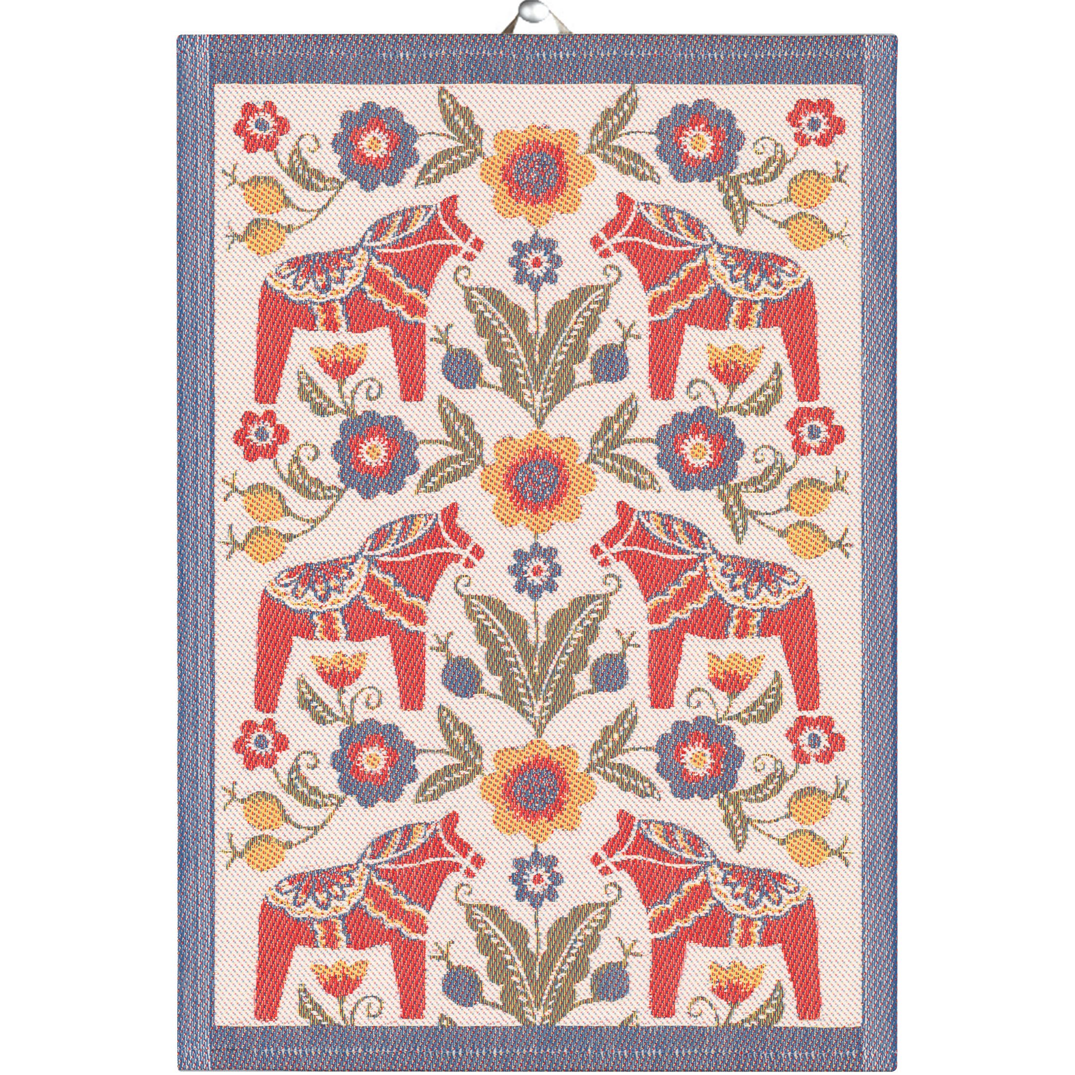Handduk från Ekelunds, tillverkad i Sverige av 100% ekologisk GOTS-certifierad bomull av högsta kvalitet. Med sitt vackra mönster av dalahästar, bladknippen och blommor blir handduken Kurbitsblom en dekorativ inredningsdetalj i köket. Perfekt för daglig användning.